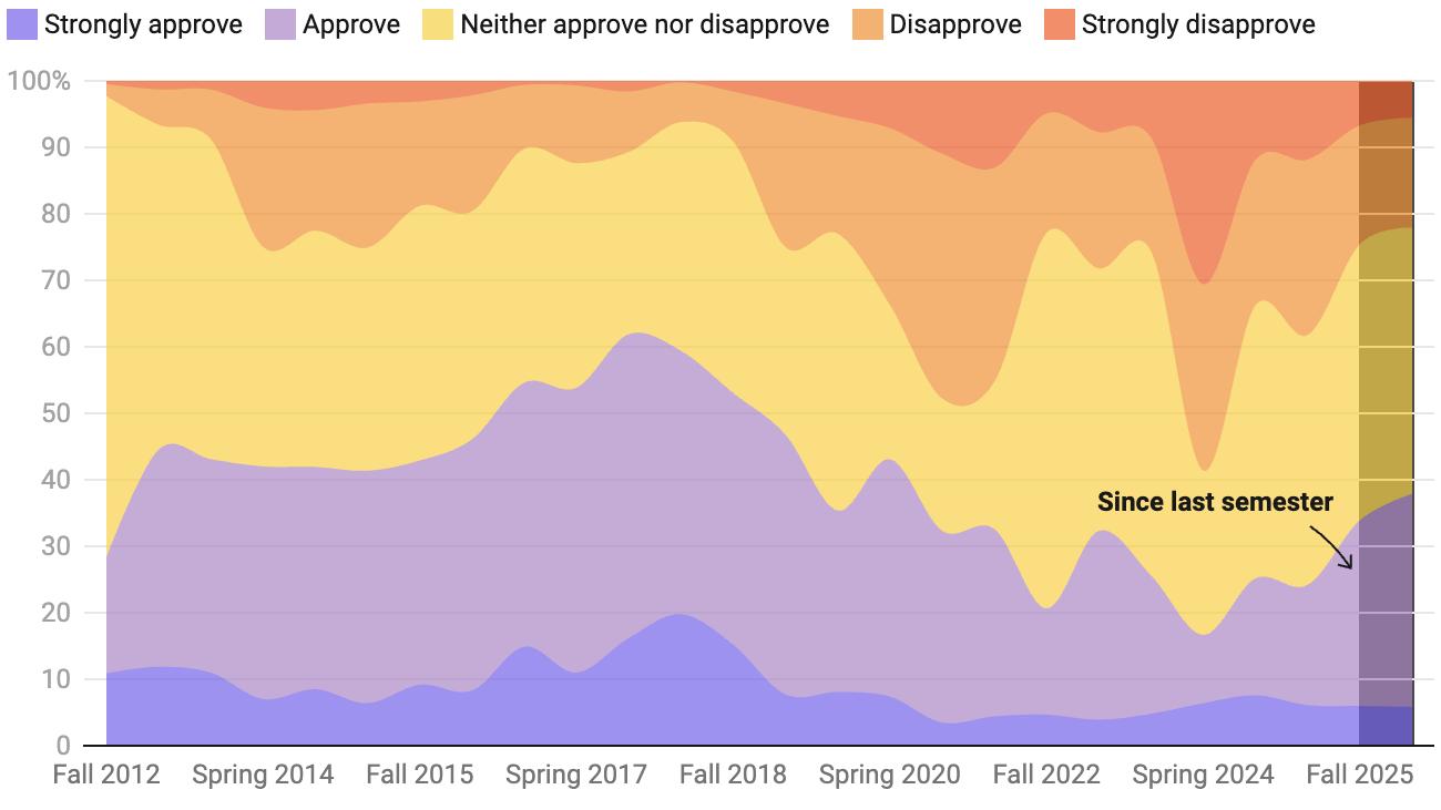 Since last semester, the approval rating for President Christina Paxson P’19 P’MD’20 has increased by 4%, with only 5.5% of respondents now strongly disapproving of her presidency. At Paxson’s peak disapproval in spring 2024, about 30% of respondents reported that they strongly disapproved of the president.