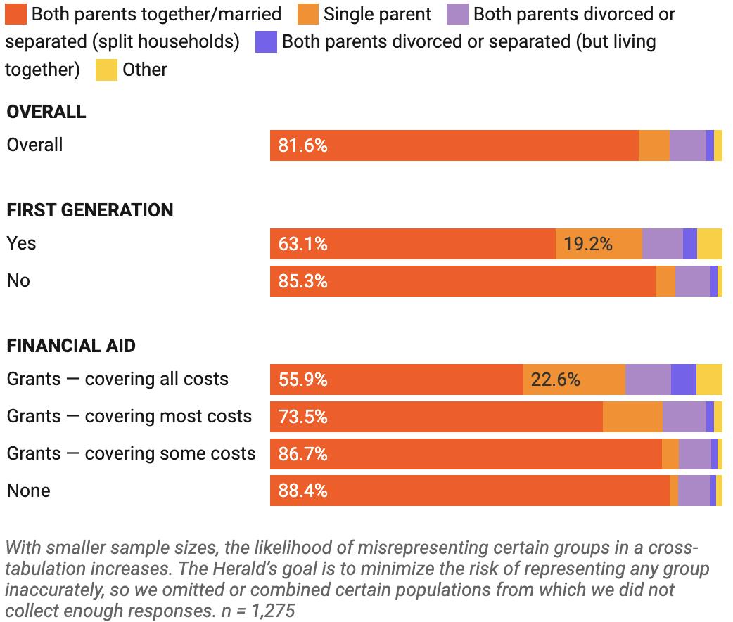 About 85% of non-first-generation students have parents who are married or together, compared to 63% of students who identify as first generation. Students on full financial aid were less likely to have parents who were married or together than those receiving partial scholarships or no aid.