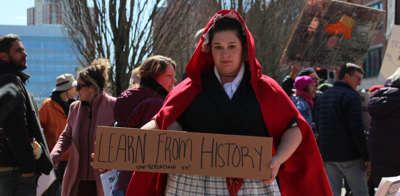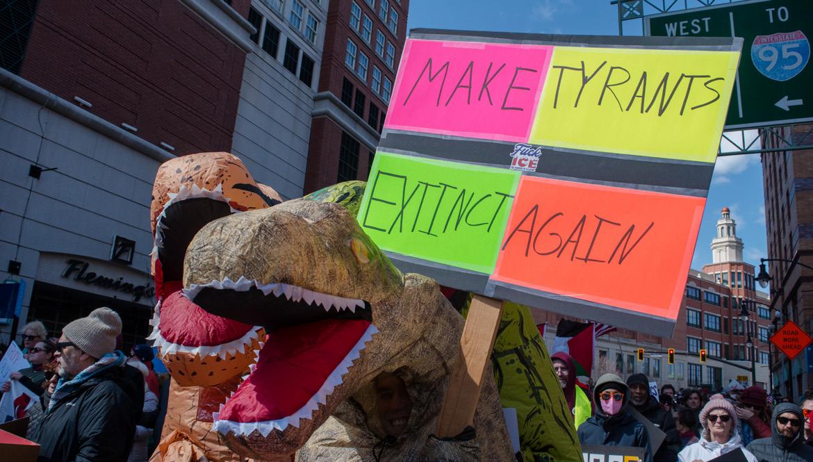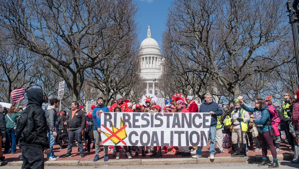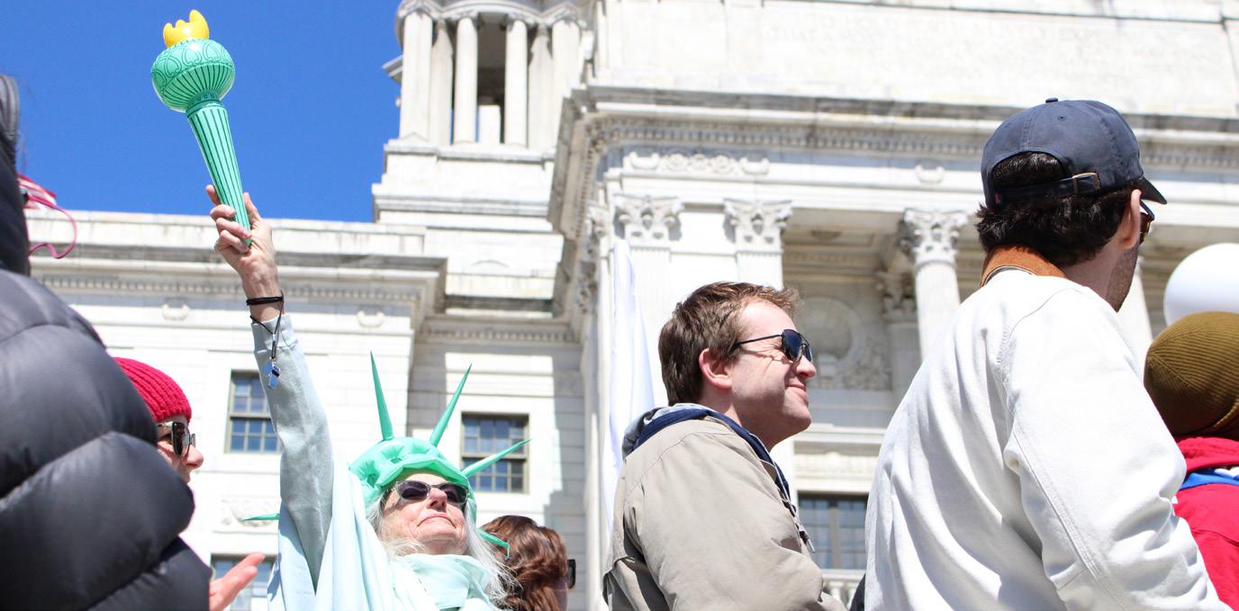 Beginning at the State House, demonstrators carried banners and signs — and some wore inflatable outfits or historical costumes — as they marched through the city. The crowd walked past Providence City Hall, through Kennedy Plaza, across