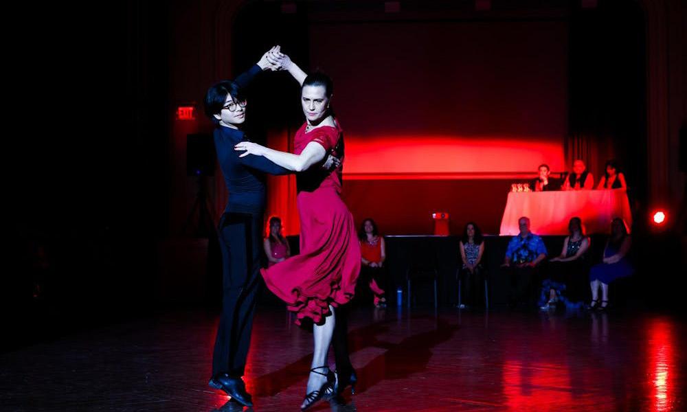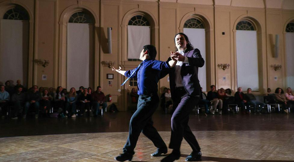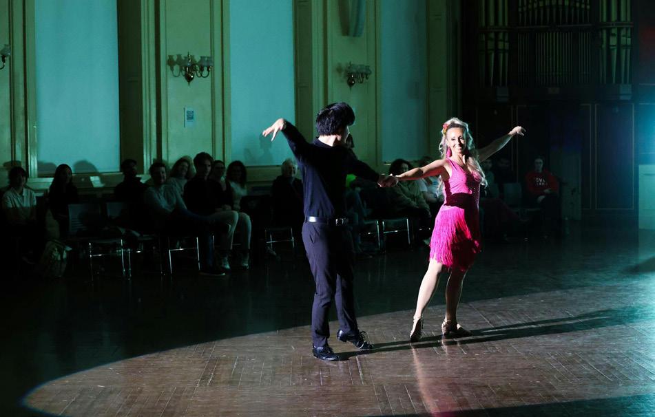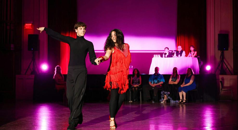 Framed by a spotlight on the ballroom floor of Alumnae Hall, Ian Chow ’28 and Associate Professor of Engineering Kareen Coulombe opened their performance of the paso doble, a Latin ballroom dance that mimics the theatrics of a bullfight, in total silence. As judge Emilie Lum ’24 MD’30 later remarked, “you could hear a pin drop.” Then, the music came in.