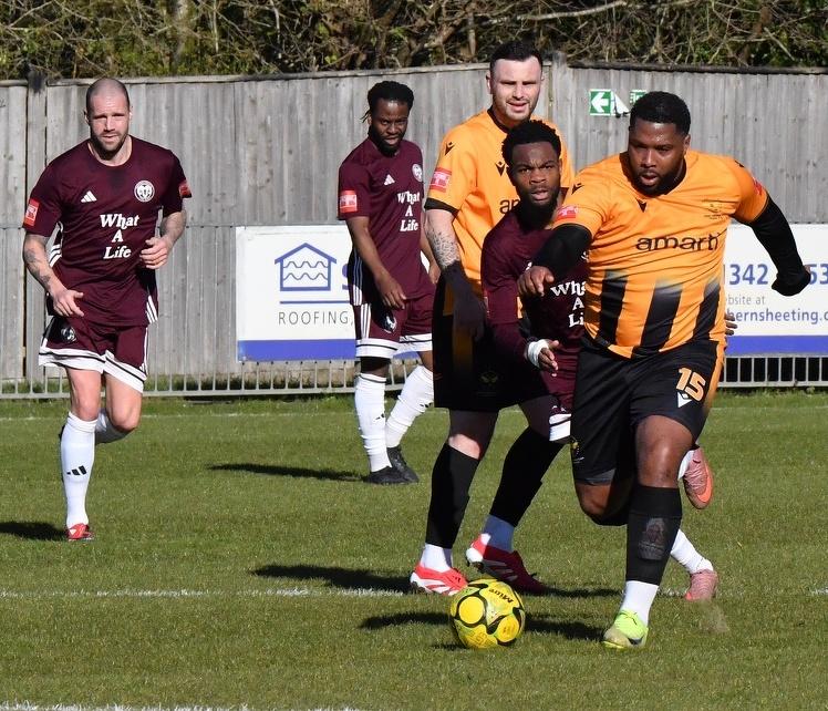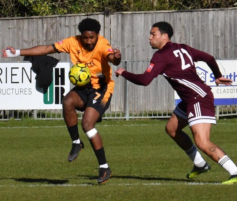A tough afternoon a fortnight ago against play-off chasing Croydon Athletic. Pics by Stuart Gibson show Jhon Murillo-Castillo and Omar Folkes testing Croydon's defence.