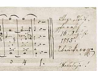 Particellskizze des Finales der 8. Sinfonie, in der bereits die Schichtung der vier Hauptthemen festgehalten ist. Anmerkung Bruckners am rechten Rand: »Steyr, Stadtpfarrhof 16. August 1885. A Bruckner m[anu] p[ropria] [i. e. mit eigener Hand]. Halleluja!«