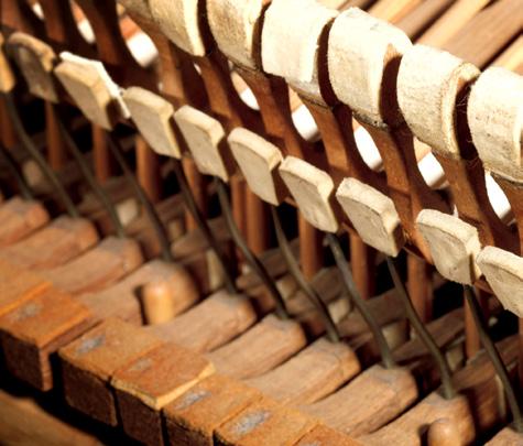 AM: Zur Erklärung: 8’ (sprich Achtfuß) entspricht den „normalen“ Tonhöhen, wie sie notiert sind und wie sie auch auf einem modernen Klavier bei gleicher Taste erklingen würden. Ein 4’Register klingt dagegen eine Oktave höher, die angeschlagene Saite ist dementsprechend halb so lang, während etwa ein 16’ um eine Oktave tiefer klingt und man im Instrument eine doppelt so lange Saite benötigen würde. Bei Instrumenten mit mehreren Registern gibt es daher mehrere sogenannte Saitenchöre und dementsprechend am Ende jeder Taste mehrere Springer, die je nach Registrierung die entsprechenden Saiten anspielen.