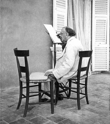 Louis Vierne beim Kopieren seiner Orgelsinfonie Nr. 6 h-moll: Mit der linken Hand liest er das in Blindenschrift skizzierte Werk und überträgt es in konventionelle Notation, 1930