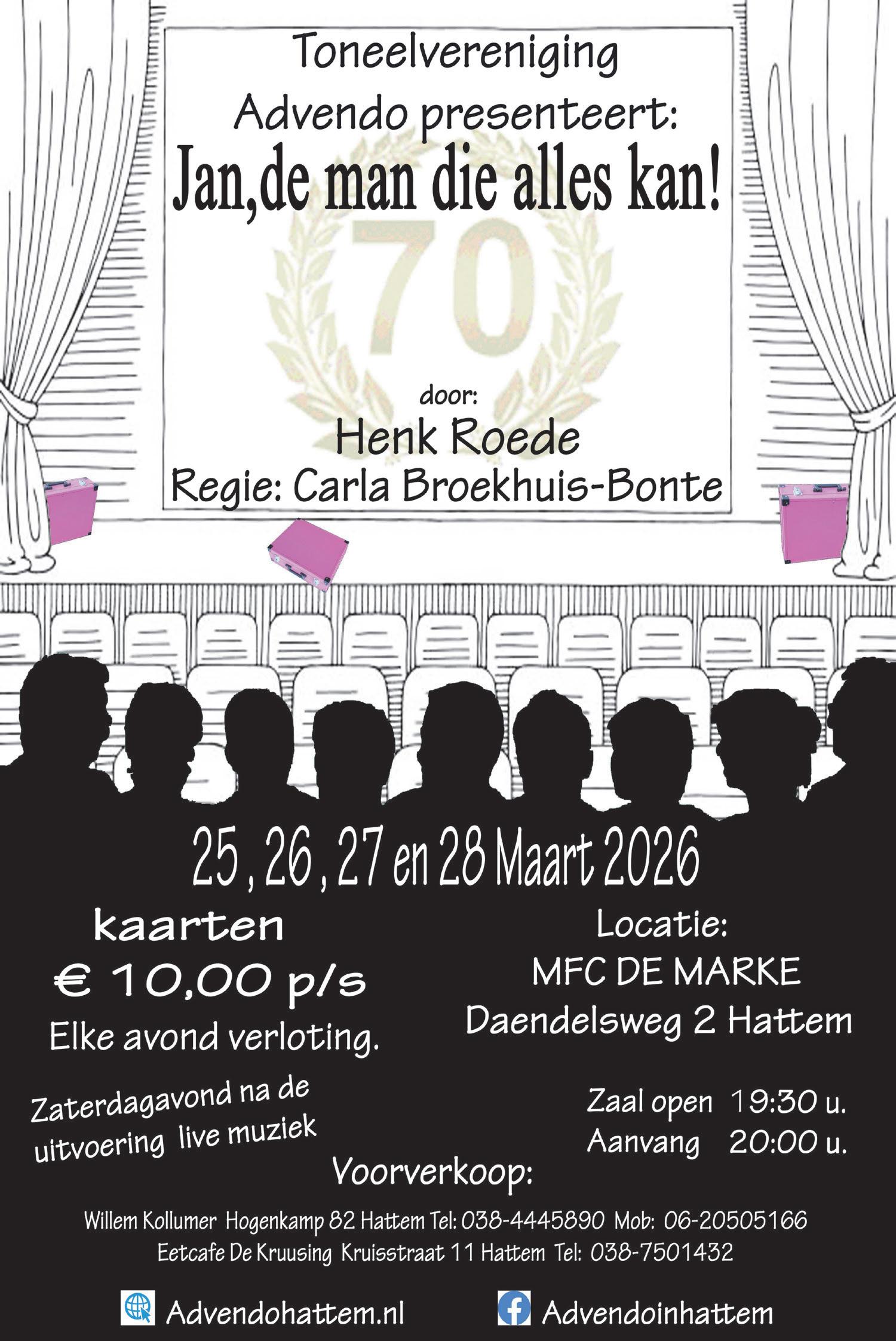 • Christelijke Gereformeerde kerk De Veste: woensdag 11 maart 19.30 uur Drs. J. Oosterbroek. Zondag 15 maart 9.30 uur Ds. H. Jonkman (bevestiging ambtsdragers), 16.30 uur Ds. H. Jonkman. Meeluisteren via internet: www.cgkhattem.nl.