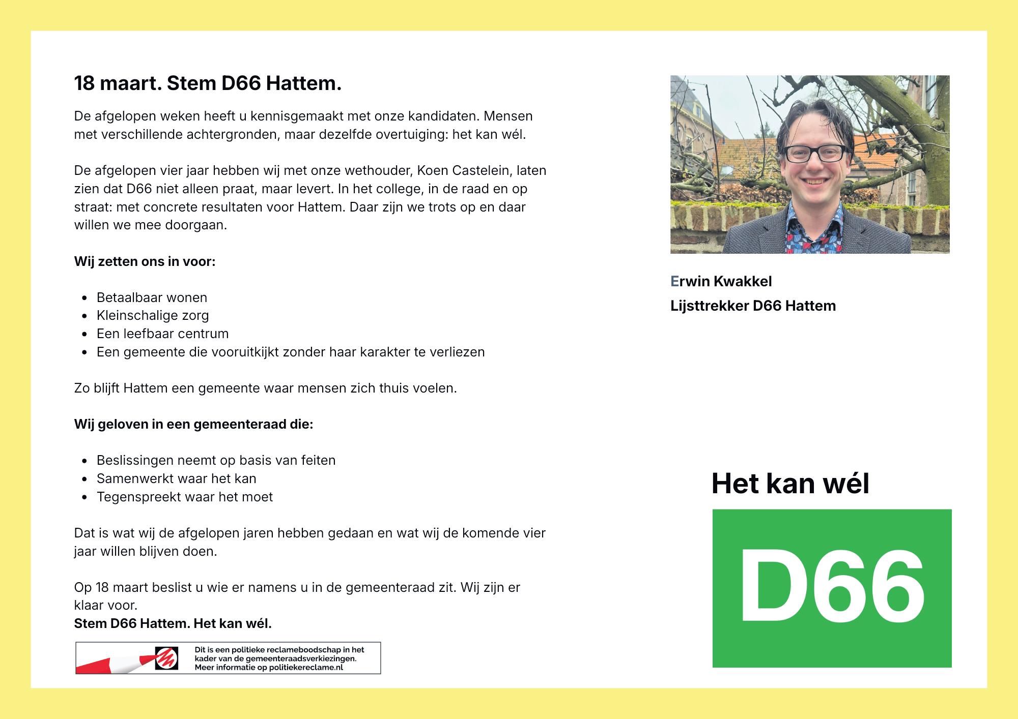 D66 Hattem laat in een persbericht weten verbaasd te zijn over de timing van deze motie. “Het college heeft de mogelijkheid van cameratoezicht zorgvuldig afgewogen. Die afweging is helder: de meldingen en waarnemingen laten onvoldoende verstoring van de openbare orde zien om dit zware middel te rechtvaardigen. Camera’s maken niet alleen inbreuk op de privacy van jongeren die er rondhangen, maar ook op die van voorbijgangers, hondenuitlaters en buurtbewoners. Het college noemt cameratoezicht een laatste redmiddel dat pas in beeld komt als alle lichtere maatregelen zijn uitgeput. D66 Hattem roept de raad op om het college de ruimte te geven de ingezette maatregelen te evalueren, in plaats van nu al te grijpen naar het zwaarste middel. Als de verlichting onvoldoende effect heeft, is een hernieuwde afweging op zijn plaats, maar dan wel via de juiste juridische route en op basis van feiten”.