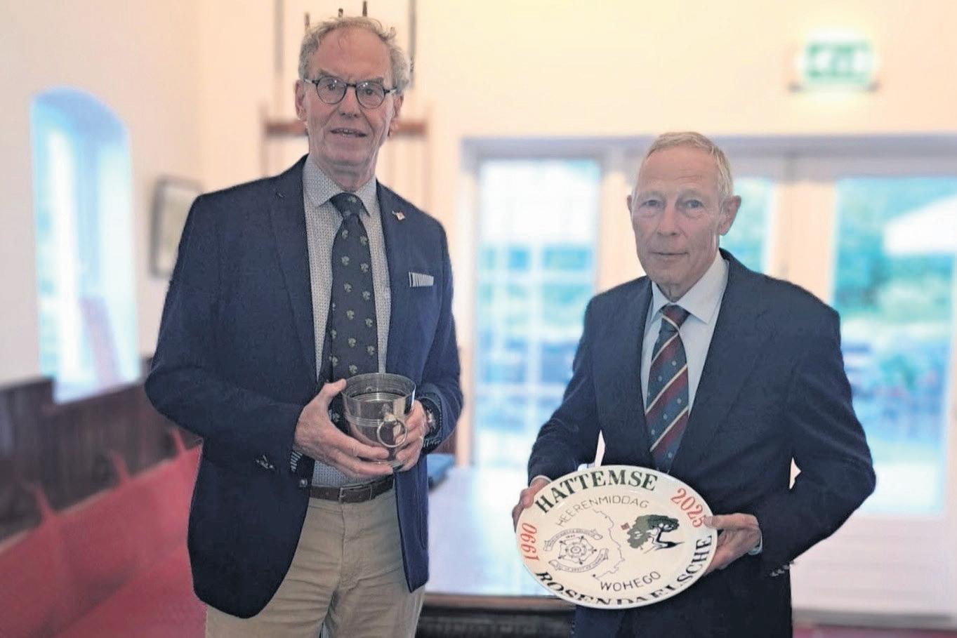 de Hattemse heren met 38 tegen 28. Daarmee kwam de totaalstand op 16 overwinningen van elk van de clubs, dus de heren houden elkaar mooi in evenwicht. De Rosendaelsche heren werden na afloop getroost met een mooie schotel, speciaal gemaakt door één van de Hattemse heren. Op de schotel naast de logo’s van beide verenigingen staat ook een verwijzing naar de IJssel, die ons beiden verbindt. Het geheel werd natuurlijk afgesloten met een koele borrel en warm buffet, dat de heren zich goed lieten smaken.
