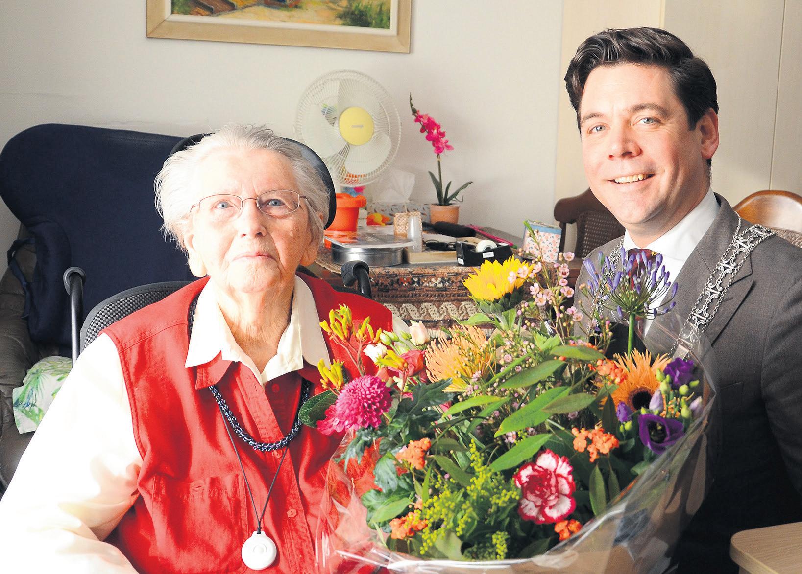 HEERDE- Mevrouw Hennie Veldkamp – van Oene is afgelopen vrijdag maar liefst 100 jaar geworden. Burgemeester Prinsen bracht de jarige een bezoek op Brinkhoven om de felicitaties namens de gemeente over te brengen. Naast bloemen ontving ze een tegeltje van het Raadhuis van Heerde. “Dat vind ik mooi!”, zei de eeuwling direct. “Een bijzonder tegeltje bij een bijzondere verjaardag”, aldus de burgemeester. Mevrouw Veldkamp- van Oene is geboren en getogen in Wezep. Ze groeide op in een gezin met 11 kinderen waarvan alleen nog haar jongste broer in leven is.