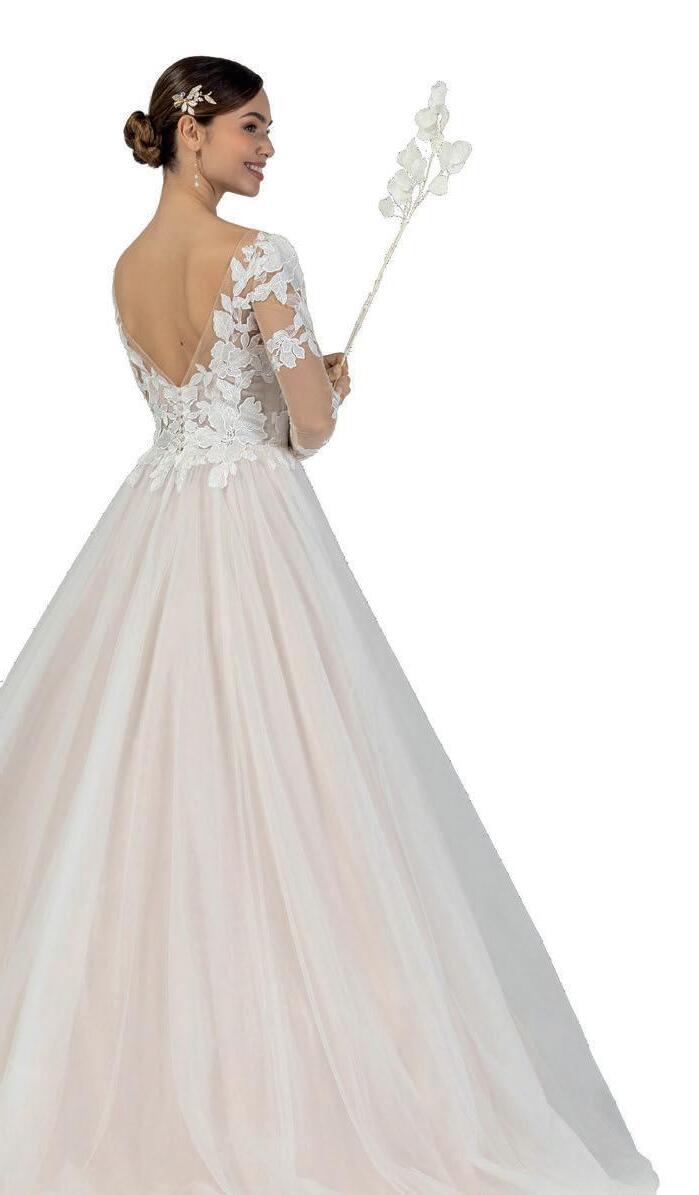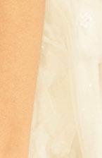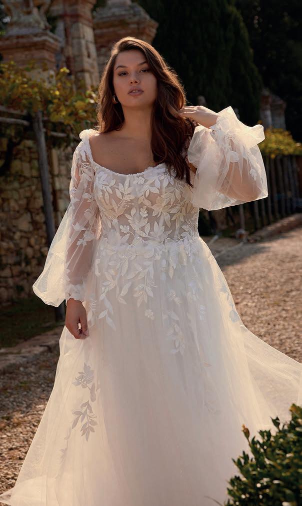 1. Tüll sieht auch bei Dornröschenärmeln romantisch und zart aus. Hier ein Beispiel aus der Kollektion Daydream von CURVES BY MODECA 2. Wabentüll ist die Grundlage für die aufwendigen Blütenapplikationen bei diesem Kleid von EGLANTINE. Die untere Schicht des Tüllrocks ist apricotfarben – das gibt einen zauberhaften Effekt. 3. Tüll wird von den Designern 2025 auch gern für Accessoires wie Handschuhe eingesetzt. Hier ein Beispiel aus der Kollektion CASABLANCA