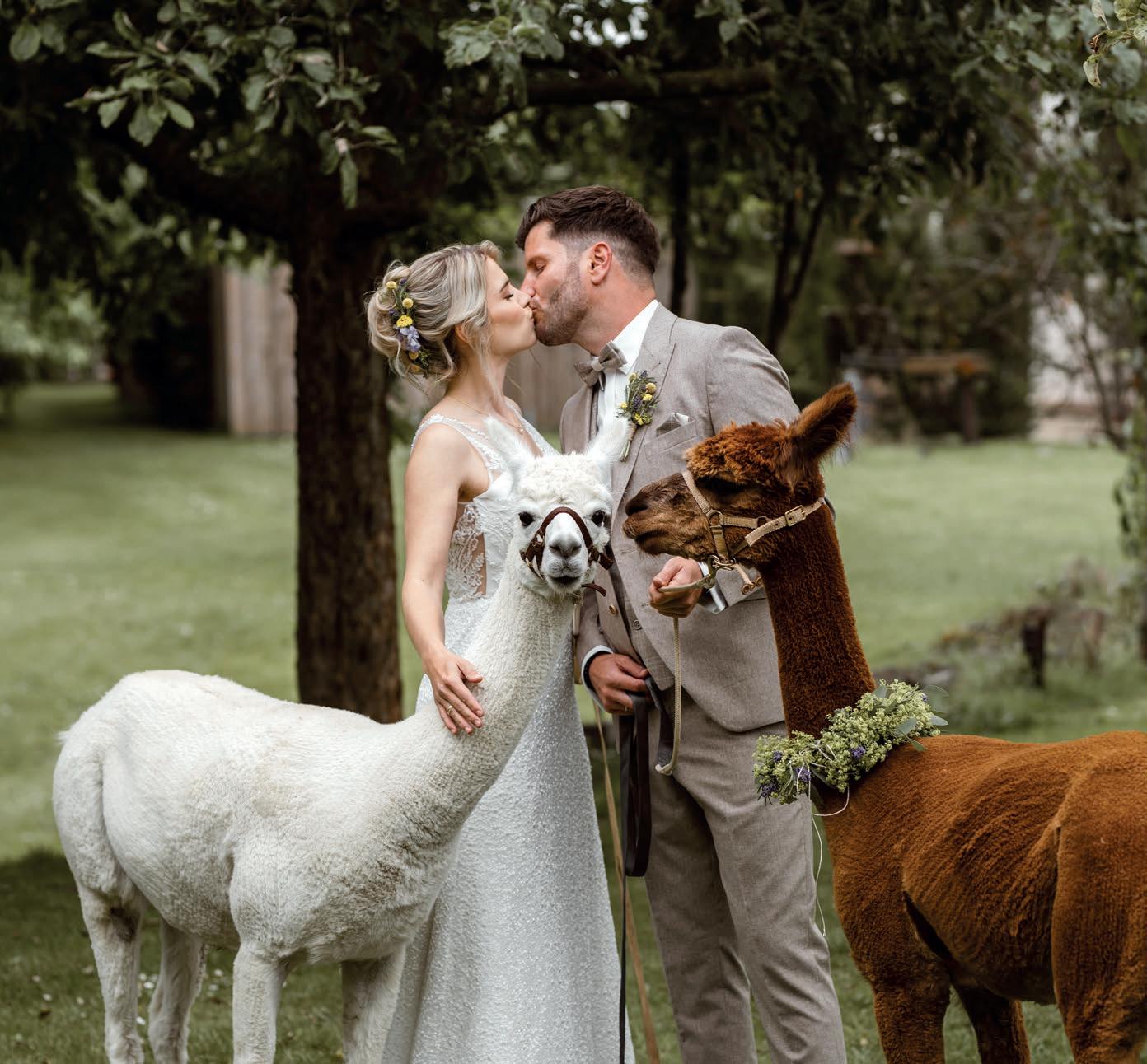 Tierische Begleiter bereichern eure Hochzeit auf charmante Weise. Alpakas beispielsweise sorgen für einzigartige Momente und außergewöhnliche Fotomotive.