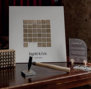 Auf insgesamt 80 Metallplättchen schlagen eure Gäste ihre Namen oder liebevolle Botschaften und hängen sie anschließend an die Gästewand. Die nötigen Tools liefern euch die Kreativfreunde als Mietobjekt gleich mit.