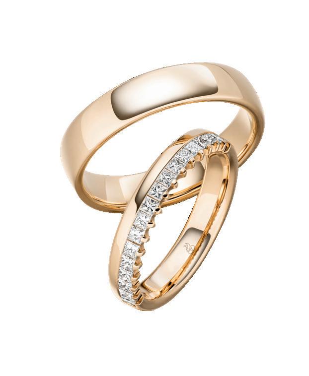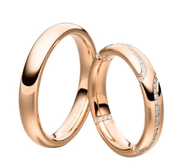 Eleganz und Symbolik vereinen sich auf wundervolle Weise im Ringpaar Salto von Henrich & Denzel. Eine funkelnde Diamantlinie aus 92 Brillanten, die sich wie ein Salto viermal von außen nach innen durch die Ringschiene aus 750er Roségold schwingt, erzählt die Geschichte ewiger Liebe und unendlicher Verbundenheit.