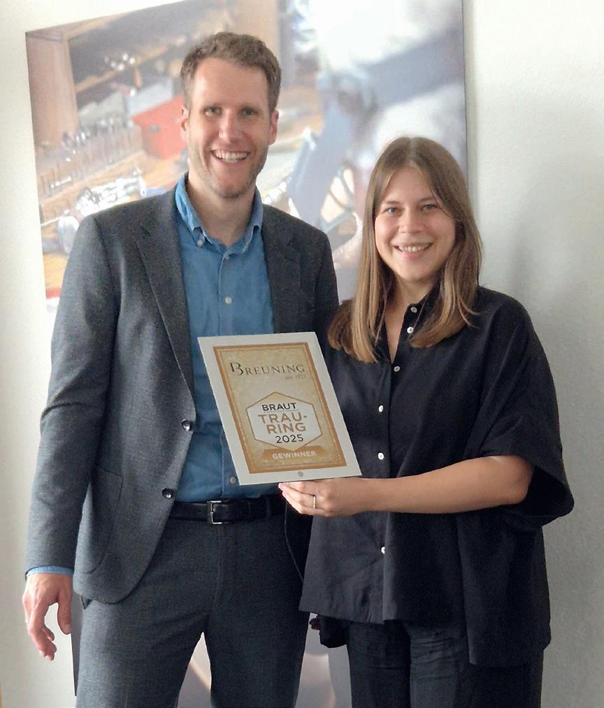 Große Freude über die Erstplatzierung bei Breuning in Pforzheim: Anna Eickhoff (Marketing) nahm stellvertretend für Geschäftsführerin Linda Breuning die Urkunde von Brautmedia-Anzeigenleiter Stefan Pöhler entgegen.