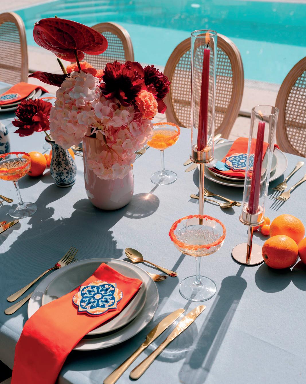 Essen unter freiem Himmel ist ein Erlebnis für sich. Der liebevoll gedeckte Tisch mit blauen Leinentischdecken, orangenen Servietten, goldfarbenem Besteck und opulenten Blumen zeigt, wie stilvoll ein Outdoor-Dinner inszeniert werden kann.