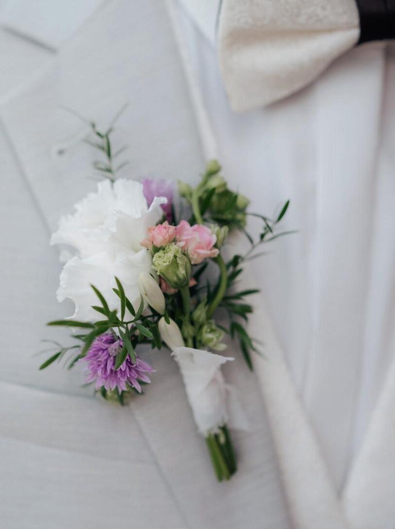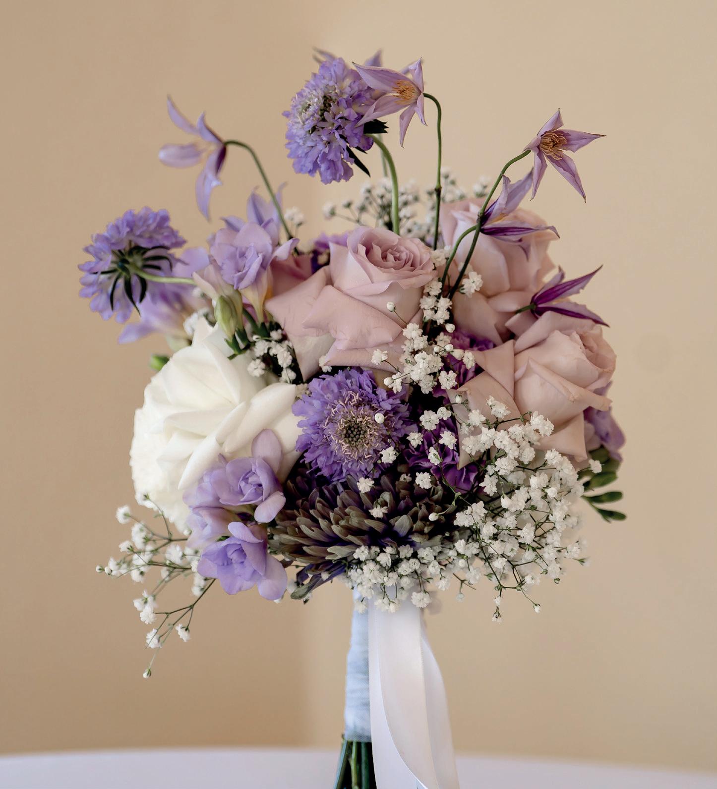 Ein Brautstrauß in Violett, Flieder, Creme und Weiß wirkt zugleich frisch und edel. Die Kombination aus Rosen in zarten Blush-Tönen und weißem Schleierkraut ist perfekt für eine romantische Frühlings- oder Sommerhochzeit.