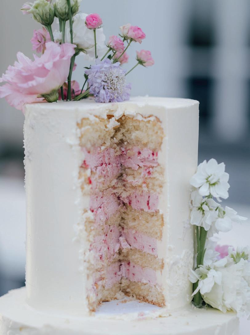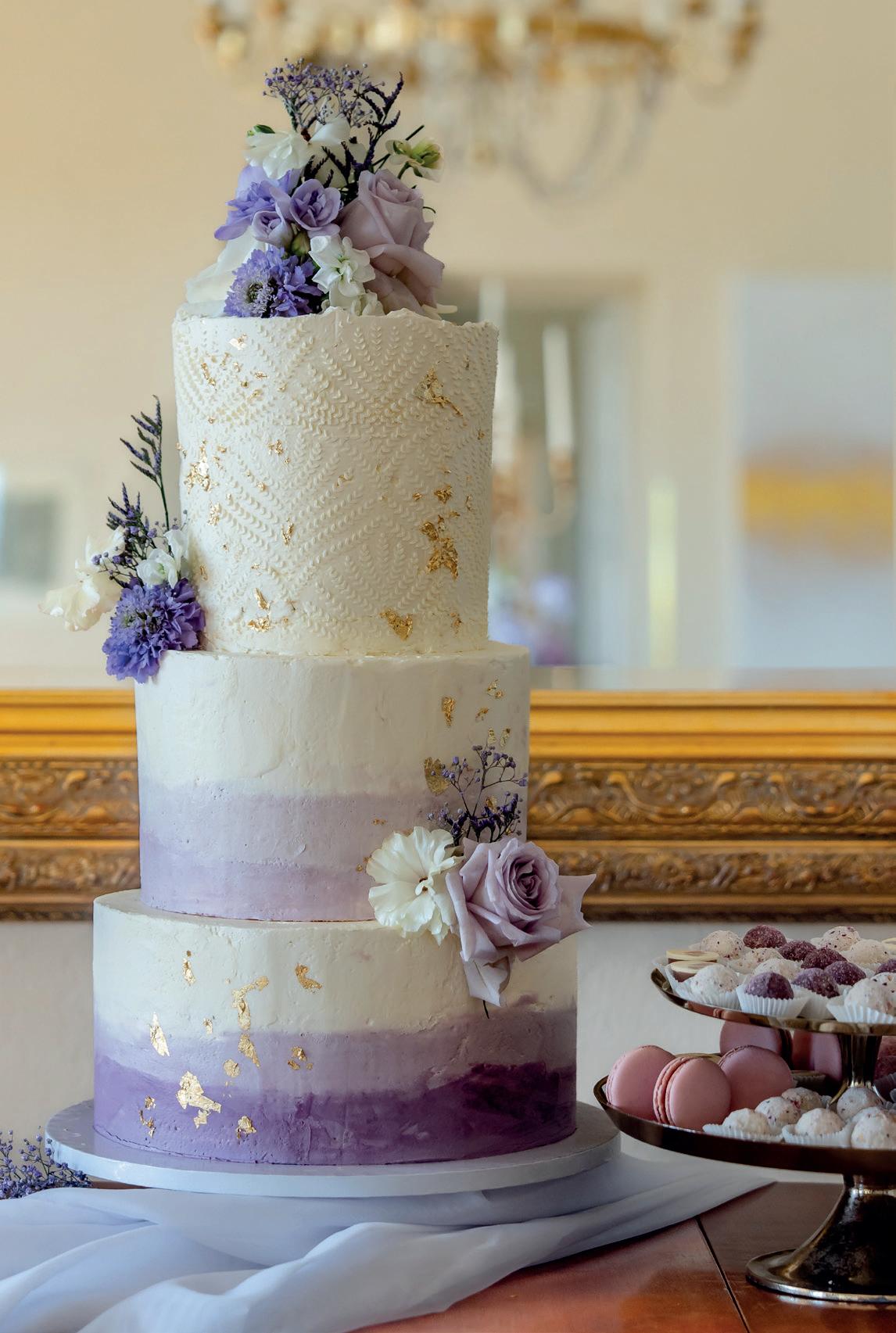 Mit frischen Blumen und Blattgold verziert, zieht die dreistöckige Hochzeitstorte alle Blicke auf sich. Sie ist mit einem zarten Farbverlauf versehen und passt supergut ins vorgegeben Farbkonzept.