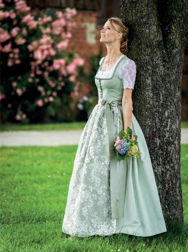 „Neben dem klassischen langen Brautdirndl in Weiß oder Creme mit Spitzenbluse sind Dirndl in zarten Pastellfarben wie Salbei, Rosé und Hellblau mit Spitzenschürzen sehr beliebt. Das Gilet und die Krawatte des Bräutigams werden farblich angepasst. Beim Sakko liegen Silber, Bronze, Salbei und Olivgrün im Trend.“