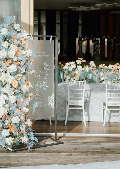 Ein Willkommenschild begrüßt eure Gäste. Wählt für die Blumendeko winterliche Farben, neben Weiß beispielsweise eisiges Blau und dezentes Peach.