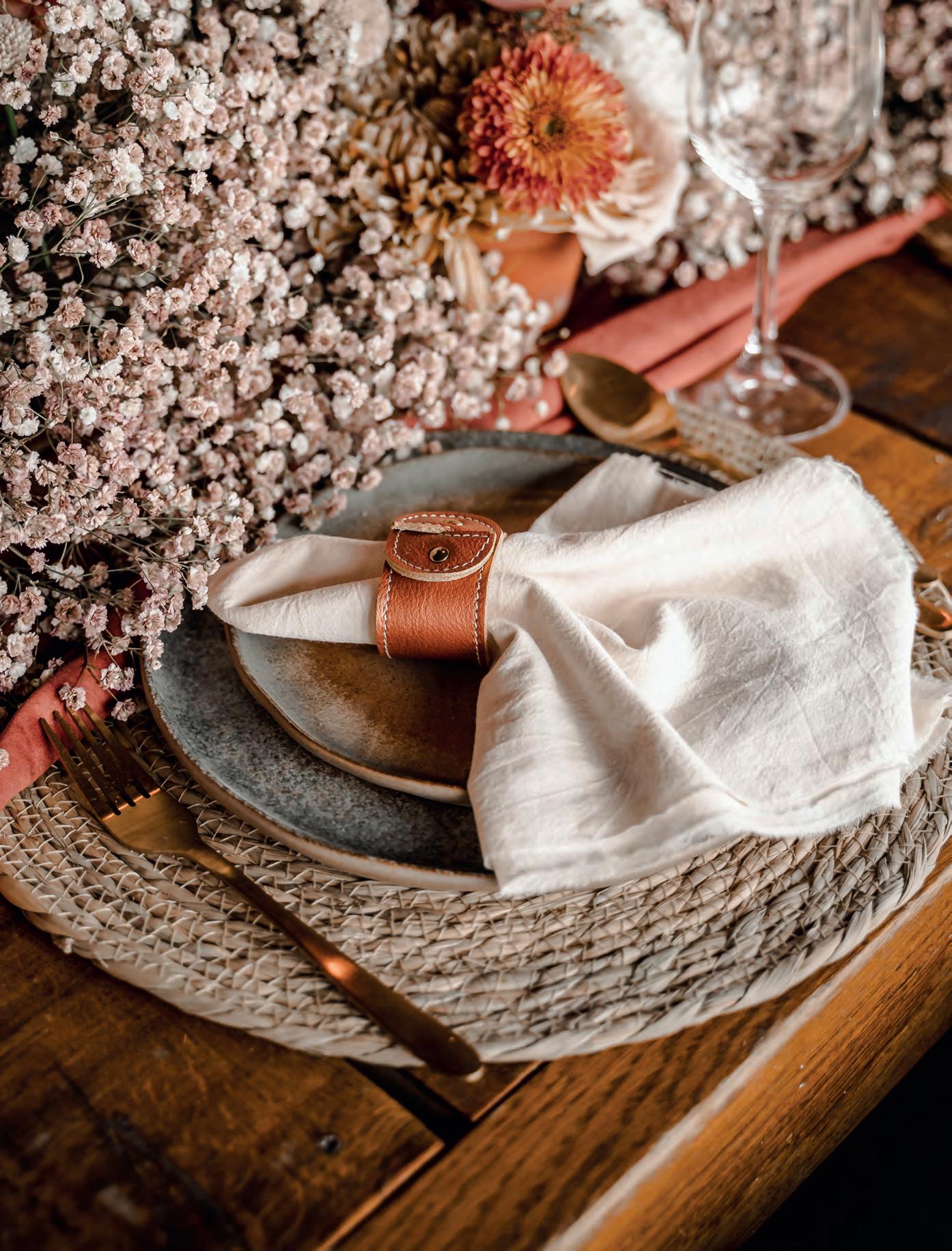 Euer Hochzeitskonzept darf sich natürlich auch in den kleinen Details widerspiegeln. Nutzt dafür zum Beispiel Servietten aus Leinen oder Serviettenringe aus Leder, die sich besonders gut auf rustikalen Holztischen machen. Kerzen in Naturtönen und Tisch-Sets aus Kork, Rattan oder Bast passen zauberhaft zu einem rustikalen Style.
