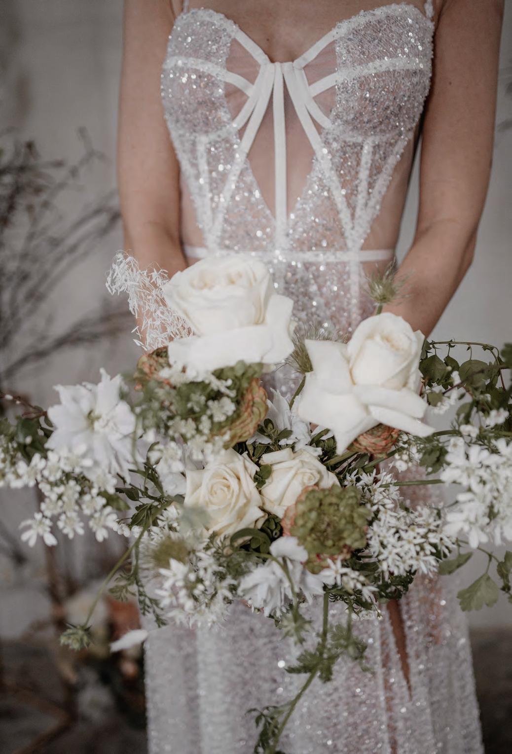Weiß- und Cremetöne sind nicht nur beim Hochzeitskleid gefragt, sondern machen sich auch superschön in deinem Brautstrauß. Hier verbinden sich weiße Rosen mit kleinen, filigranen Wiesenblumen und ein bisschen Grün zu einem zauberhaften Ensemble. We love!