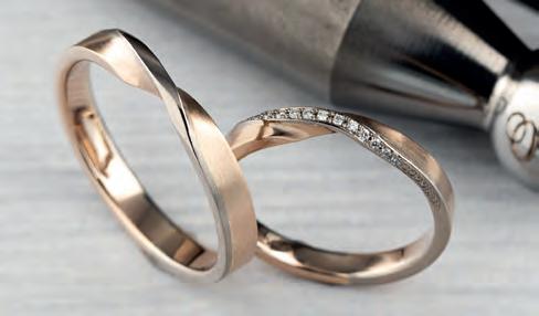 Dieses Trauringpaar symbolisiert den schimmernden Schwung, den die Liebe in das geradlinige Leben zweier Menschen bringt. Die Ringe bestehen aus einer eigenkreierten Goldlegierung, dem „Champagner-Rose“, kombiniert mit feinstem Weißgoldrand und Diamanten. www.bilz-goldschmiede.de