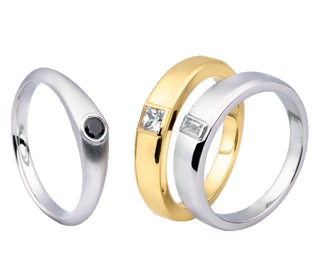 Schlicht, zurückhaltend und trotzdem ein Hingucker: So präsentieren sich die Partnerringe von Breuning. Es gibt sie mit hellen und dunklen Steinen. Die Ringschiene ist dyna misch geformt.