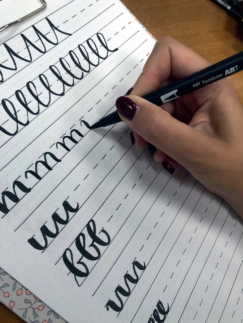 Die schwungvollen Linien werden vorgezeichnet und zwar mit Bleistift. Nele versichert uns „Selbst Handlettering Q ueens zeichnen vor.“ Danach dür fen wir uns an die kräftigen Farbstifte herantasten: Wir starten mit dem Brush Pen. Die Kombination aus Pinselspitze und Farbtank macht aus ihm ein geniales Werkzeug für das Handlettering. Damit gelingen die dickeren Linien. Fineliner wiederum sind eure Geheimwa en für die dünneren Schrifttypen, aber auch zum Ausbessern.