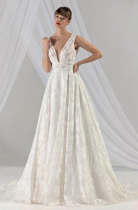 Brokat ist ein luxuriöser, schwerer Stoff, der in der Brautmode für seine edle Optik und Struktur geschätzt wird. Er zeichnet sich durch eingewebte Muster, oft aus Goldoder Silberfäden, aus. Durch seine feste Struktur eignet sich Brokat besonders gut für voluminöse Kleider und figurbetonte Schnitte.