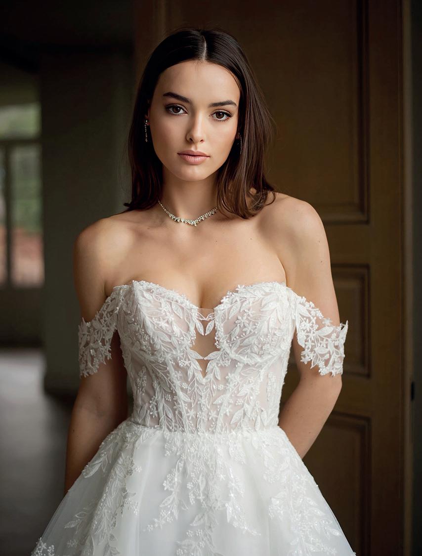 „Clorinde“ verzaubert mit floraler Spitze, tiefem V-Ausschnitt und einem schimmernden Tüllrock. Bianco Evento zeigt hier sein Können, seine Schleier perfekt auf die Styles abzustimmen.