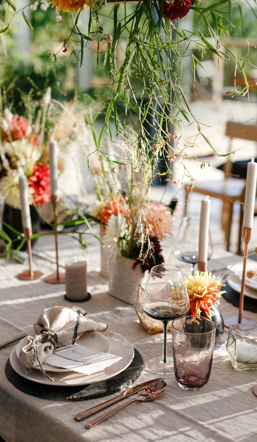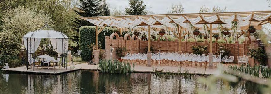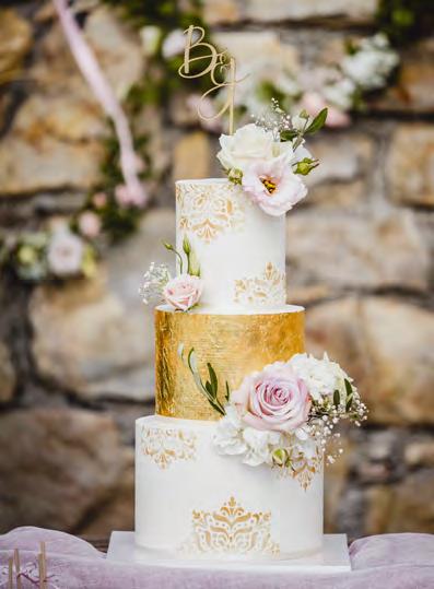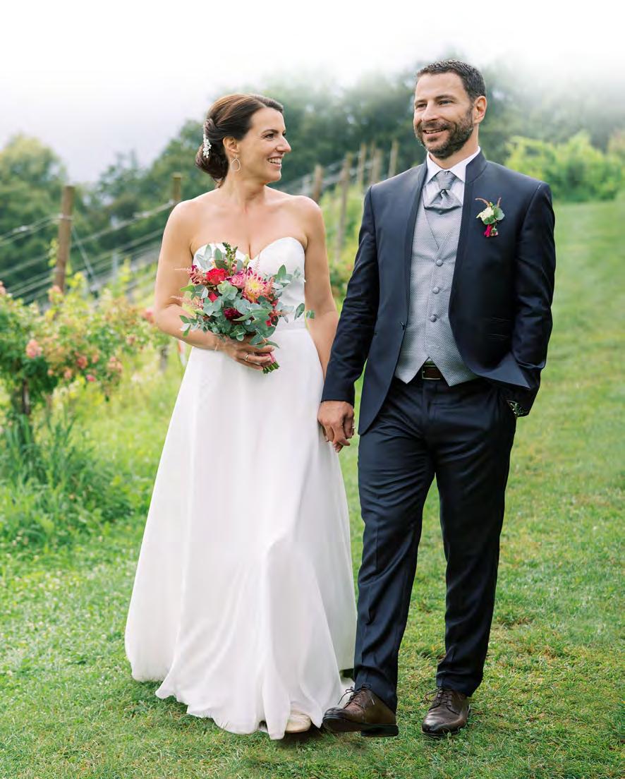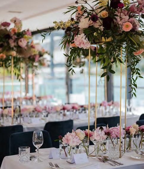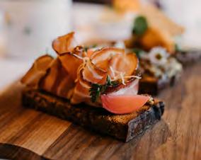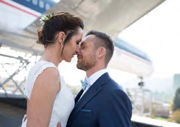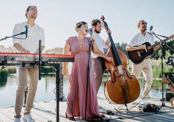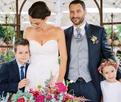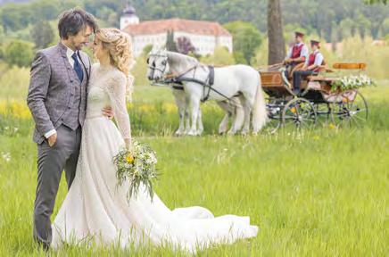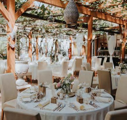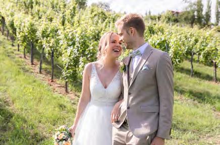 das Paar zum Shooting in die Weinberge. Am Nachmittag sorgte Zauberer Joe Bärnthaler von den „Zauberkoffern“ sowohl bei den kleinen als auch bei den großen Gästen für staunende Überraschungsmomente. Bei seinen Tricks ließ er sich aber nicht in die Karten schauen. Dann bat das Paar auch schon zur Festtafel. Die großzügigen Glasfronten des Saales ließen einen Blick auf die romantische Hügellandschaft zu. Bevor die Vorspeise serviert wurde, gab es für die Hochzeitsgäste noch etwas zu Schmöke rn. Die Hochzeitszeitung – eine Überraschung der Trauzeugin und Schwester der Braut –hielt unterhalt same Anekdoten, Fotos und Beiträge der Familien und Freunde parat. Während des Essens sorgten berührende Worte des Bräutigams, seines Bruders und Vaters sowie der Tante und des Onkels der Braut für emotionale Momente. Ausgelassen wurde zur Live M usik gefeiert und getanzt und das rauschende Hochzeitsfest ging für Kathrin und Christoph dort zu Ende, wo sie sich vor vielen Jahren kennengelernt haben. Beim gemütlichen Weißwurst B runch am nächsten Morgen wurde der große Tag nochmal Revue passiert. „Es war wunderschön mit all unseren Lieben diesen besonderen Tag zu feiern“, so das Paar.
