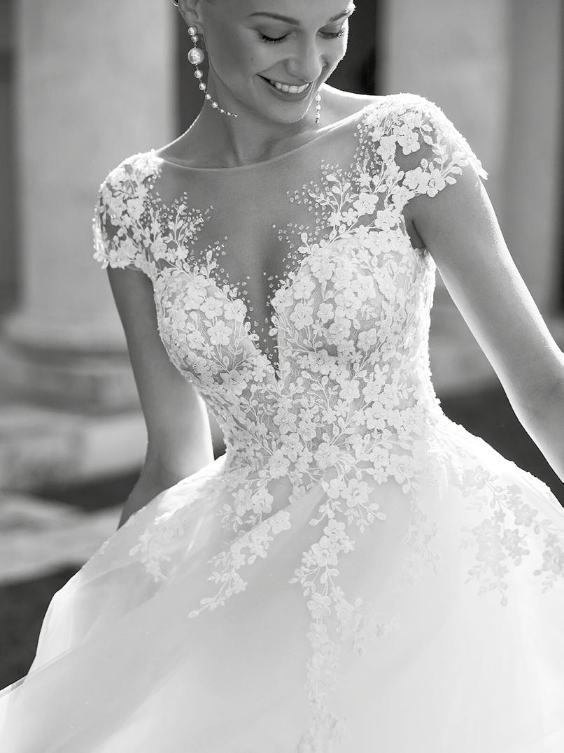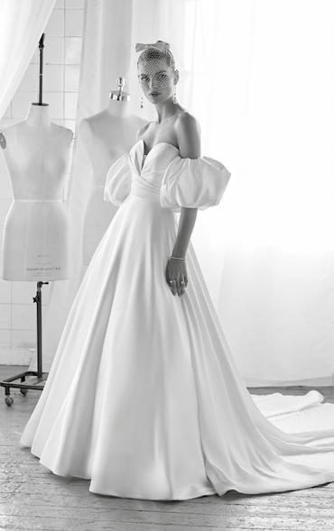 bruidsjurk van hoogwaardig zijde past in de trendy clean chic-stijl. Het zet de bruid zeker in de spotlight! De uitbundige pofmouwen en geraffineerde plooien rond het decolleté zijn speelse details.