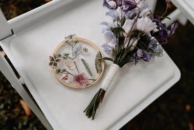 Trauringpräsentation mal anders: Statt in einer Ringschatulle oder Ringbox sind die Trauringe an einen Stickrahmen geknotet. Auf diesem Rahmen können Stickbegeisterte die Initialen des Paares oder ein schönes Hochzeitsmotiv verewigen.