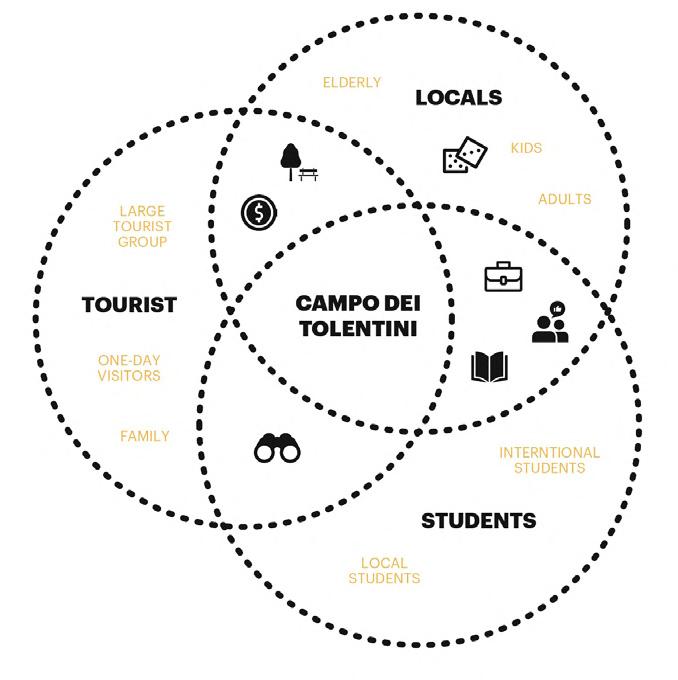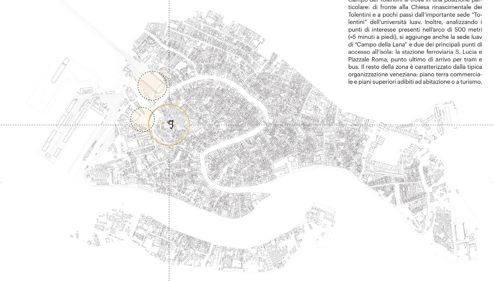 La propuesta se plantea en torno al Campo dei Tolentini en Venecia, un lugar de paso y punto de encuentro para estudiantes, turistas y habitantes de la ciudad. El proyecto busca llevar y mostrar experiencias locales al público en un lugar alejado de las atracciones turísticas, generando asi una visión nueva de Venecia. El intercambio de conocimientos y experiencias sociales que ofrece el proyecto a través de juegos y otras actividades, permitirá redescubrir y establecer nuevos lazos entre ciudadanos y turistas conscientes