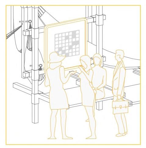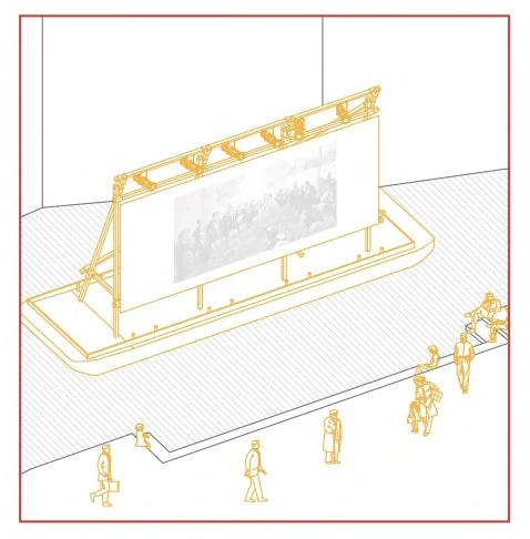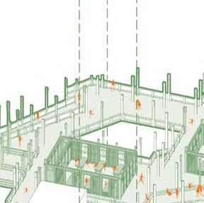 Se plantea una estructura conformada por andamios para conectar el espacio de la plaza con los edificios circundantes e ingresando en ellos a través de aberturas existentes en la fachada, logramos acercar y elevar la superficie sobre dos o tres niveles.