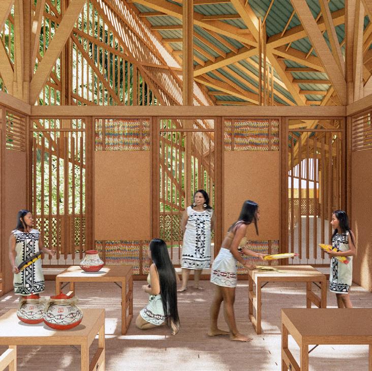 El diseño modular del proyecto se inspira en la Maloca, un espacio flexible y multifuncional que alberga actividades educativas, comunitarias y turísticas, adaptándose a las culturas locales. El módulo rectangular, orientado este-oeste para maximizar el confort climático y protegido por una doble fachada norte-sur, tiene una altura de 3.5 m siguiendo la Guía de Diseño Bioclimático.