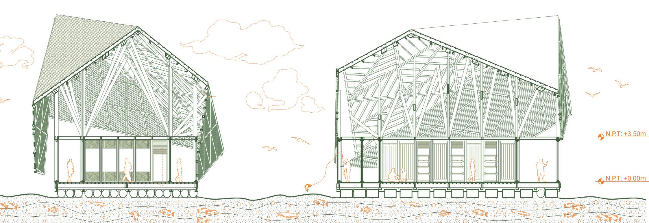La exploración de la forma parte del lugar, donde el edificio se diseña para brindar confort térmico a sus usuarios tanto en época de máxima creciente, de la cual se protege al elevarse +5.50mts sobre pilotes, y en la época de vaciante, donde se mantienen usos temporales bajo la misma plataforma elevada.