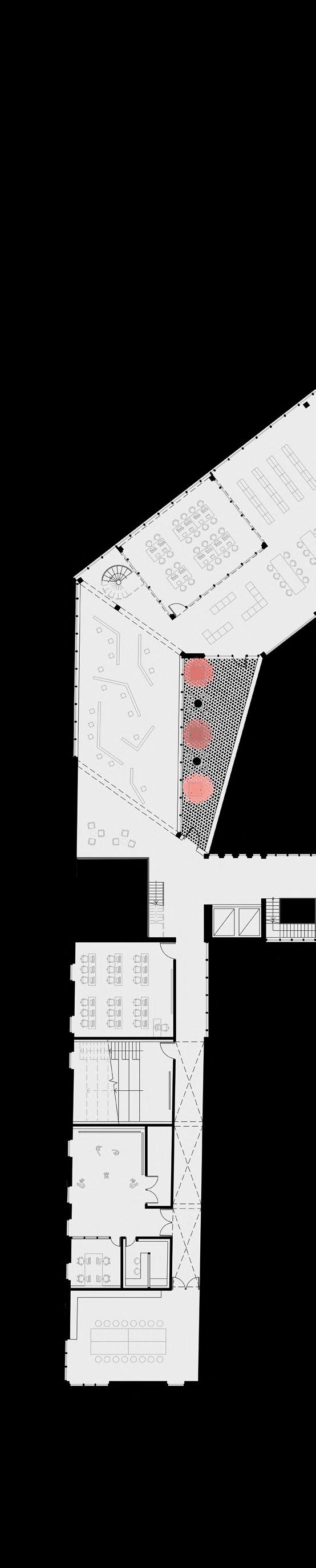 Estas nuevas salas públicas funcionan como nichos para muestras, exposiciones, restaurantes y bares, cualquier actividad generalmente realizada en un primer piso, que en esta ocación, se levanta y dispersa del suelo.