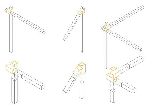 Se plantea una unión que permite la estructuración de los andamios de madera. Esta misma es utilizada para el mobiliario y piezas móviles.