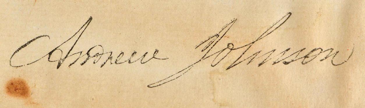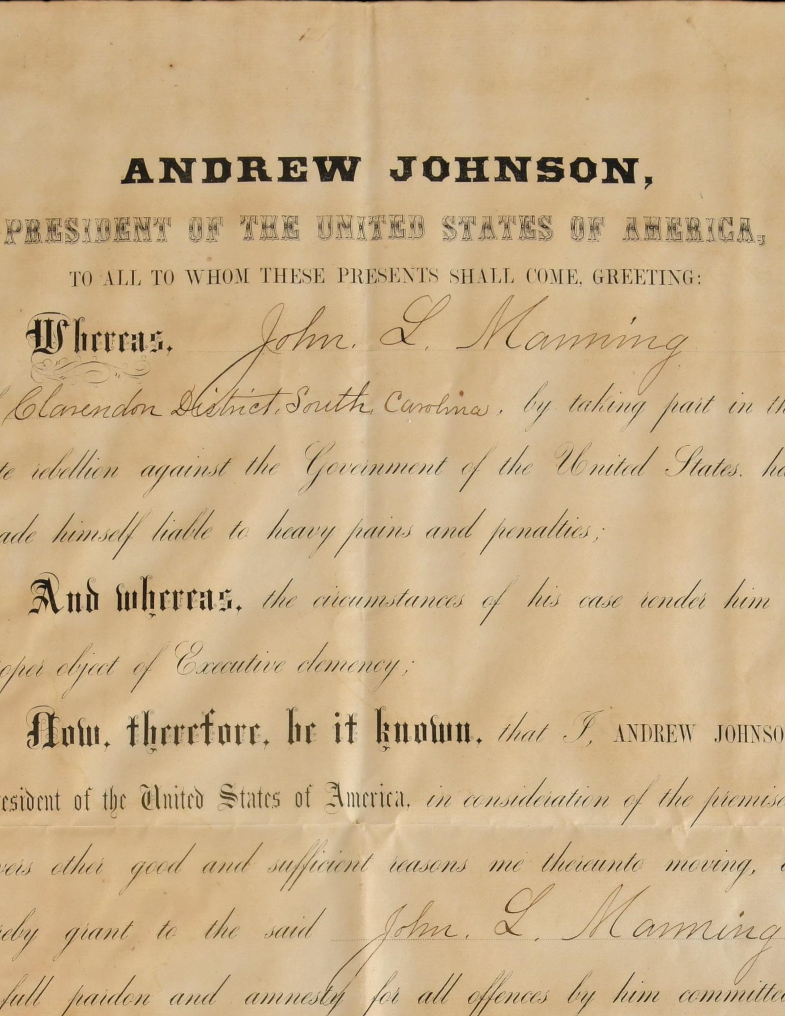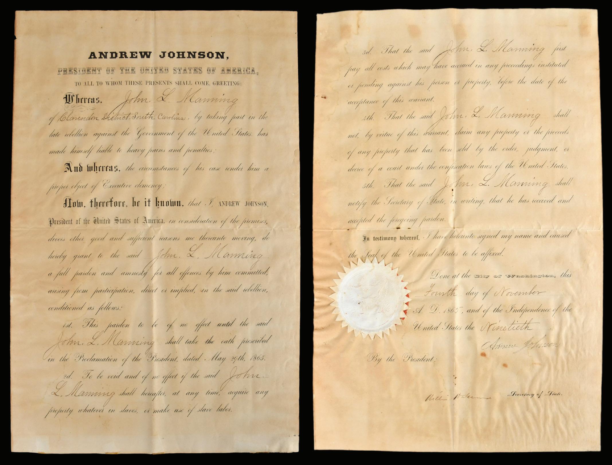 Important Pardon for S.C. Governor John Manning, by President Andrew Johnson on two separate leaves, dated November 4, 1865, pardon and amnesty for all offences committed by former South Carolina Governor John Manning of the Clarendon District, for his part in the “rebellion against the Government of the United States”, with affixed seal, bearing signatures of President Andrew Johnson and Secretary of State William Seward, 17-1/2 x 11-1/4 in. each leaf, toning, foxing, water stained (most notable at back), pinholes, tape remnants at periphery and back, visually pleasing despite the preceding qualifiers
