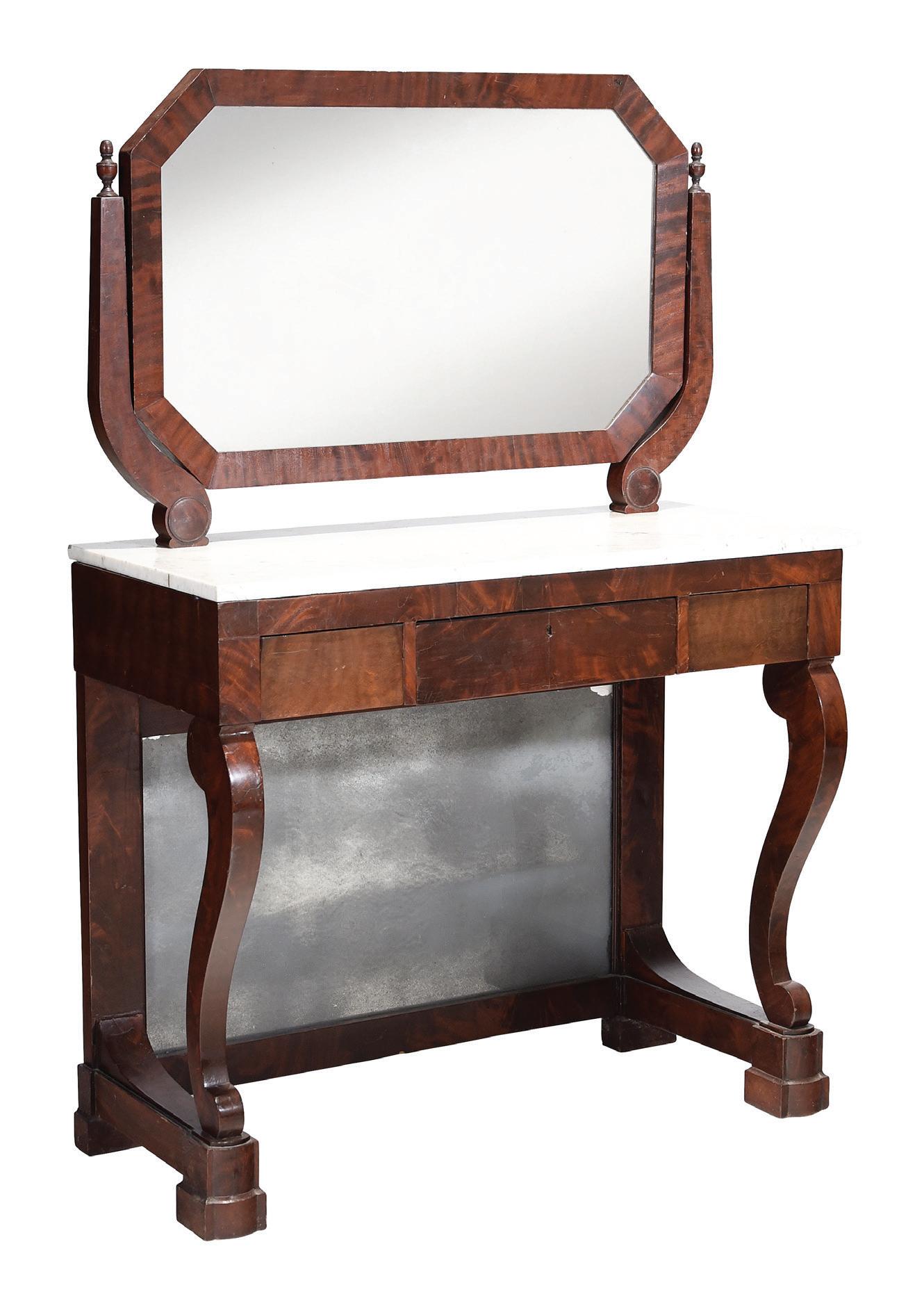 Duncan Phyfe American Late Classical Dressing Table with Mirror From Millford Plantation attributed to Duncan Phyfe, mid 19th century, poplar and ash(?) mixed secondary woods, octagonal mirror held on curved supports with turned finials, white marble top, scrolled supports and original mirrored back, underside of one drawer incised with “JM 81”, 78 x 42 x 20 in., veneers with wear, chips and repairs throughout; hinged mirror with later pane and supports lacking stabilizing blocks; marble top scratched; wear to drawers