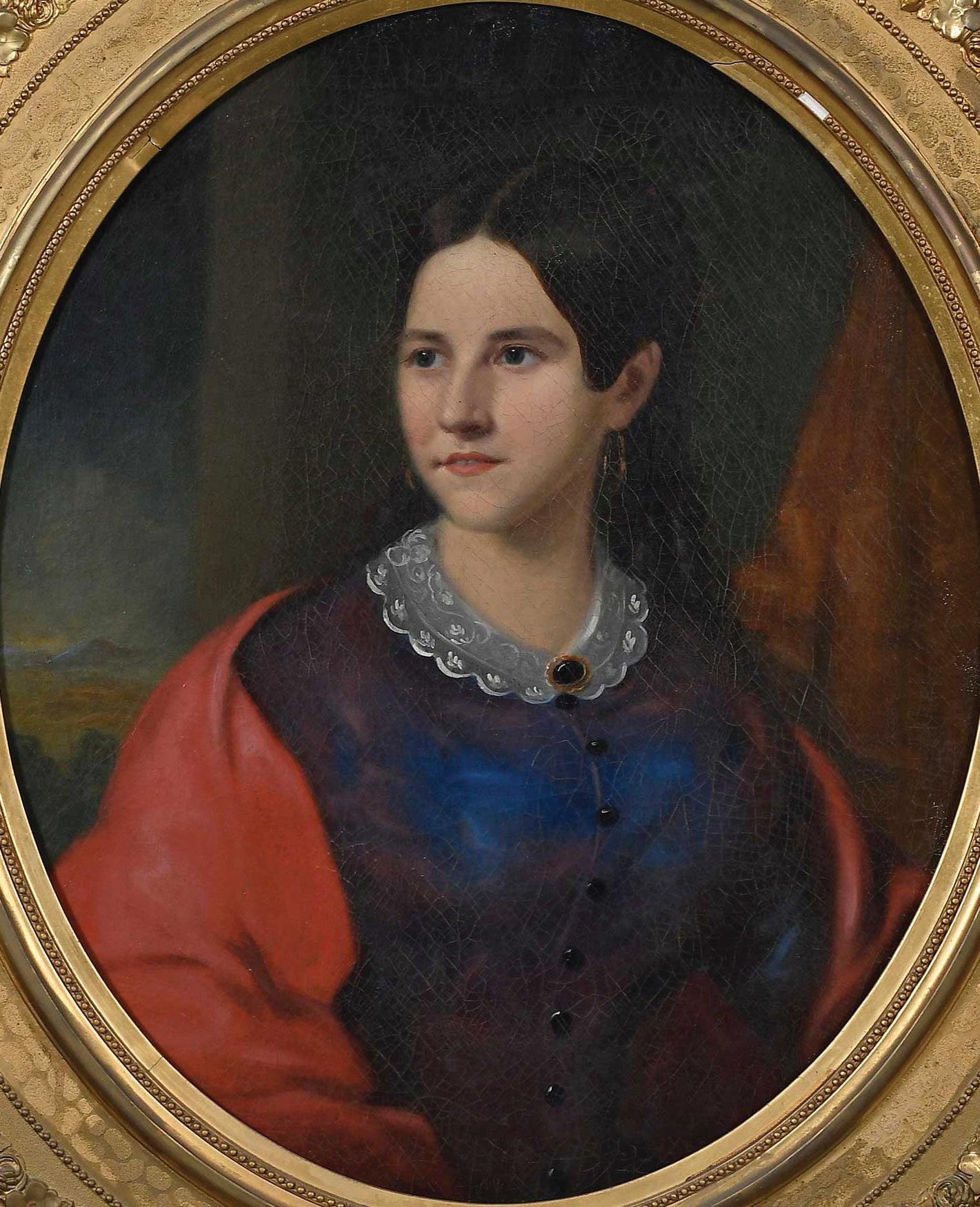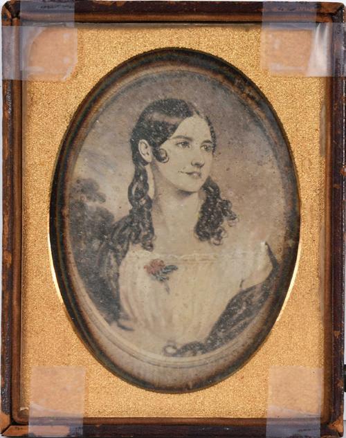 Accompanied by a daguerreotype of the sitter. Mary Ellen Clarke Gordon was the sister of Sally Bland Clarke Manning, wife of South Carolina Governor John Laurence Manning, who governed from 18541856. With prayer book of Mary Good Clarke., wax lined, crackle, cupping, retouch, surface dirt; frame with wear and abrasions, losses, resurfaced; book with wear and losses to leather, front board detached, rear board beginning at head and tail of rear hinge, free fly papers partially adhered to pastedowns, text block toned and foxed throughout, tear and loss along top edge of index at rear