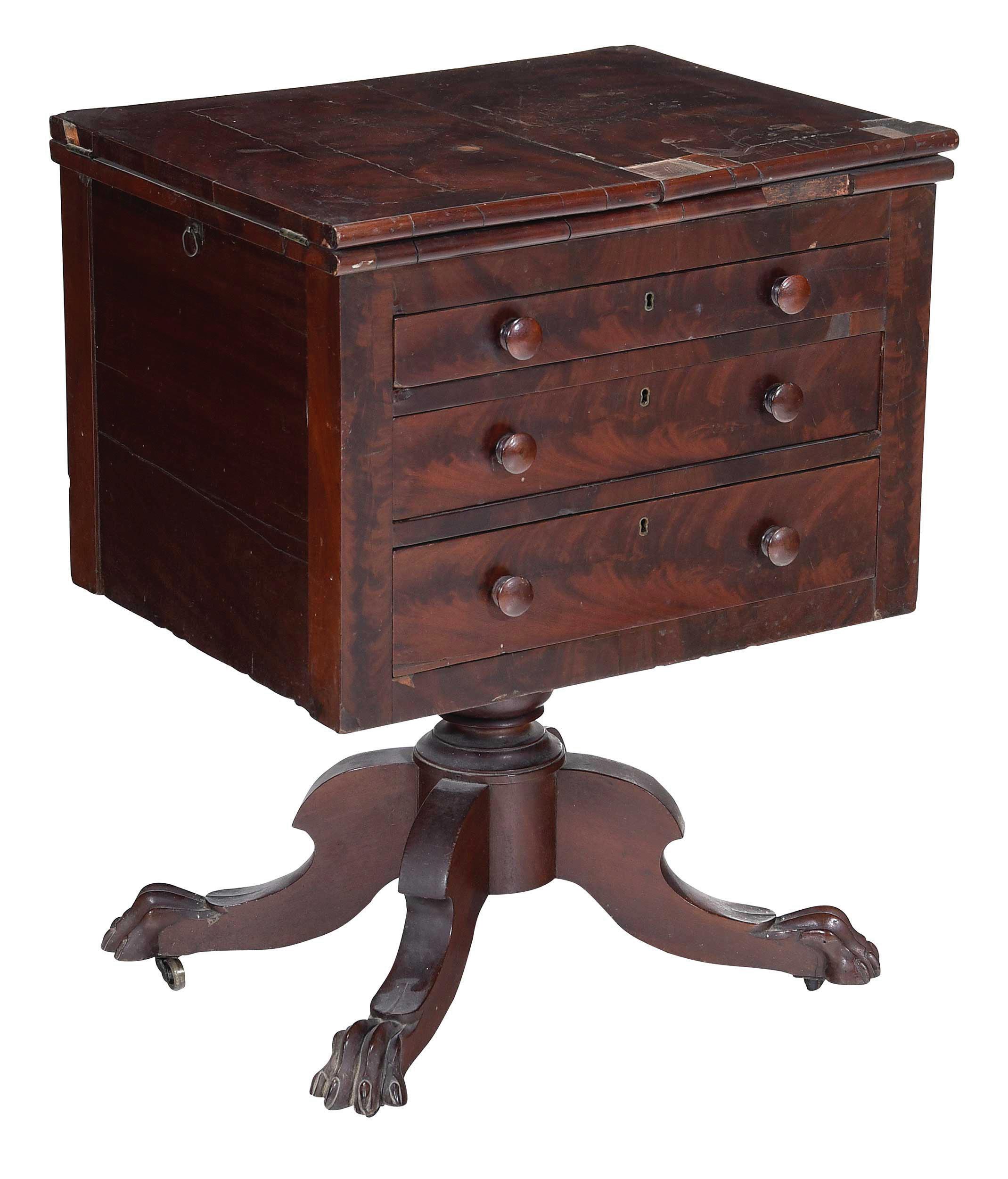 Classical Mahogany Three Drawer Work Table Possibly from MIllford Plantation probably New York, 19th century, poplar secondary wood, top opens to reveal work surface, 29 x 22-1/4 x 17-1/4 in., significant wear and loss to veneer with some restoration, working surface missing leather, shrinkage splits at sides and back, feet with scattered repairs and one loss