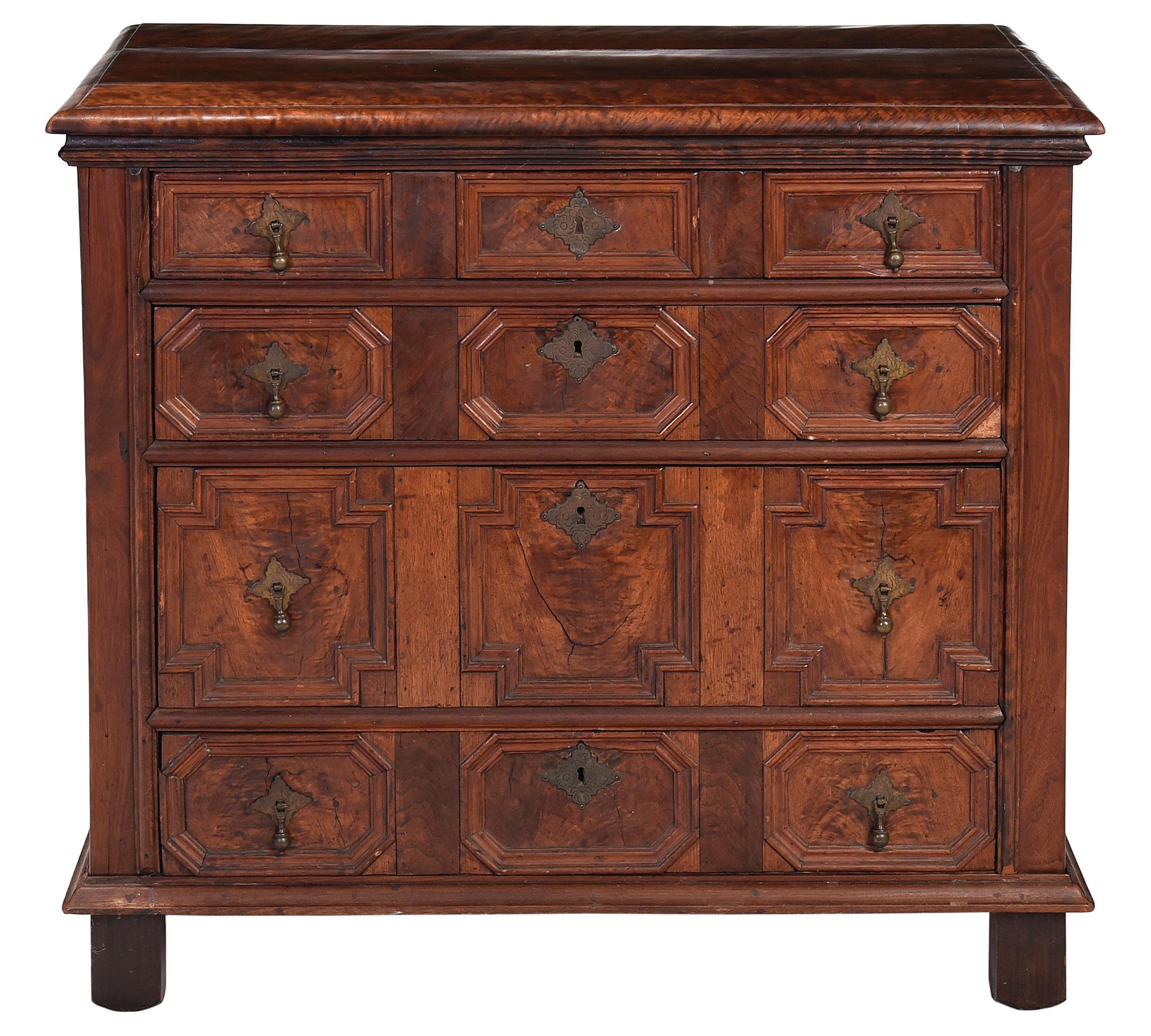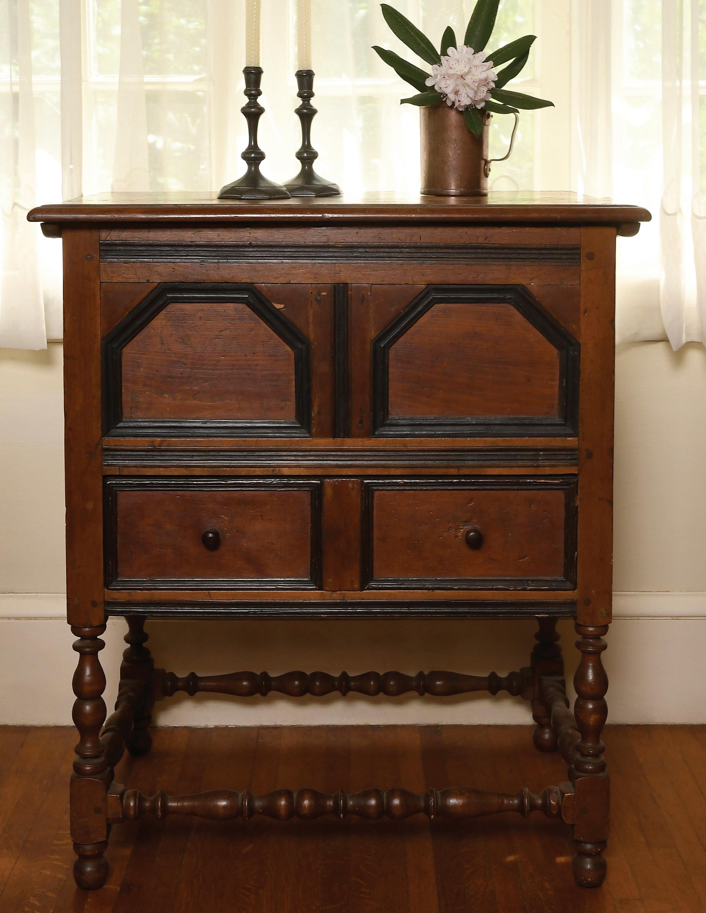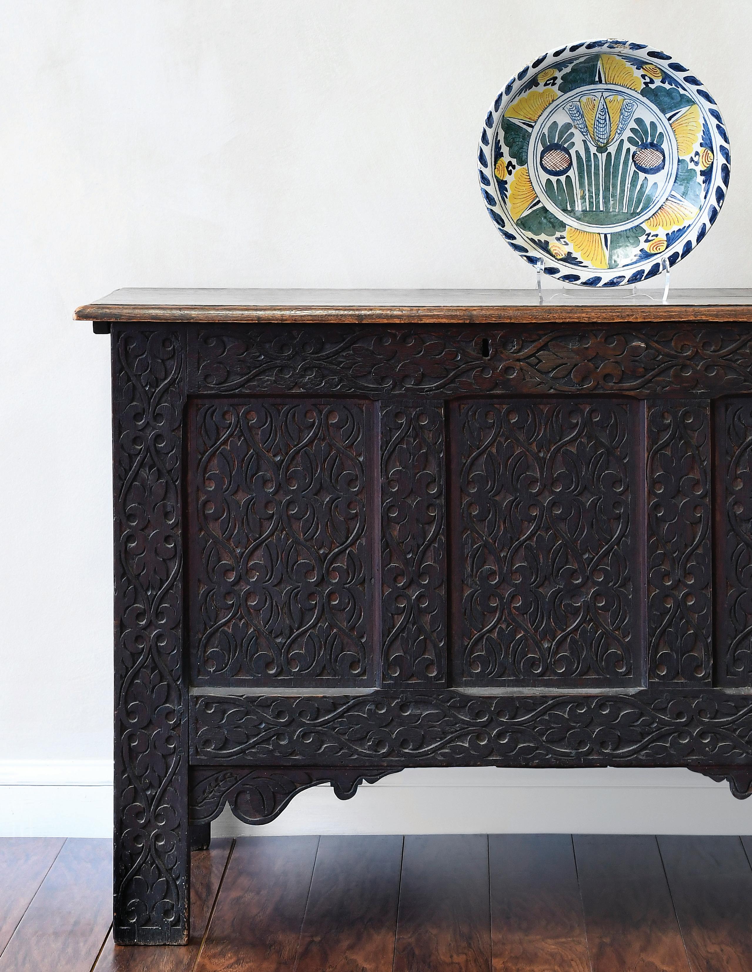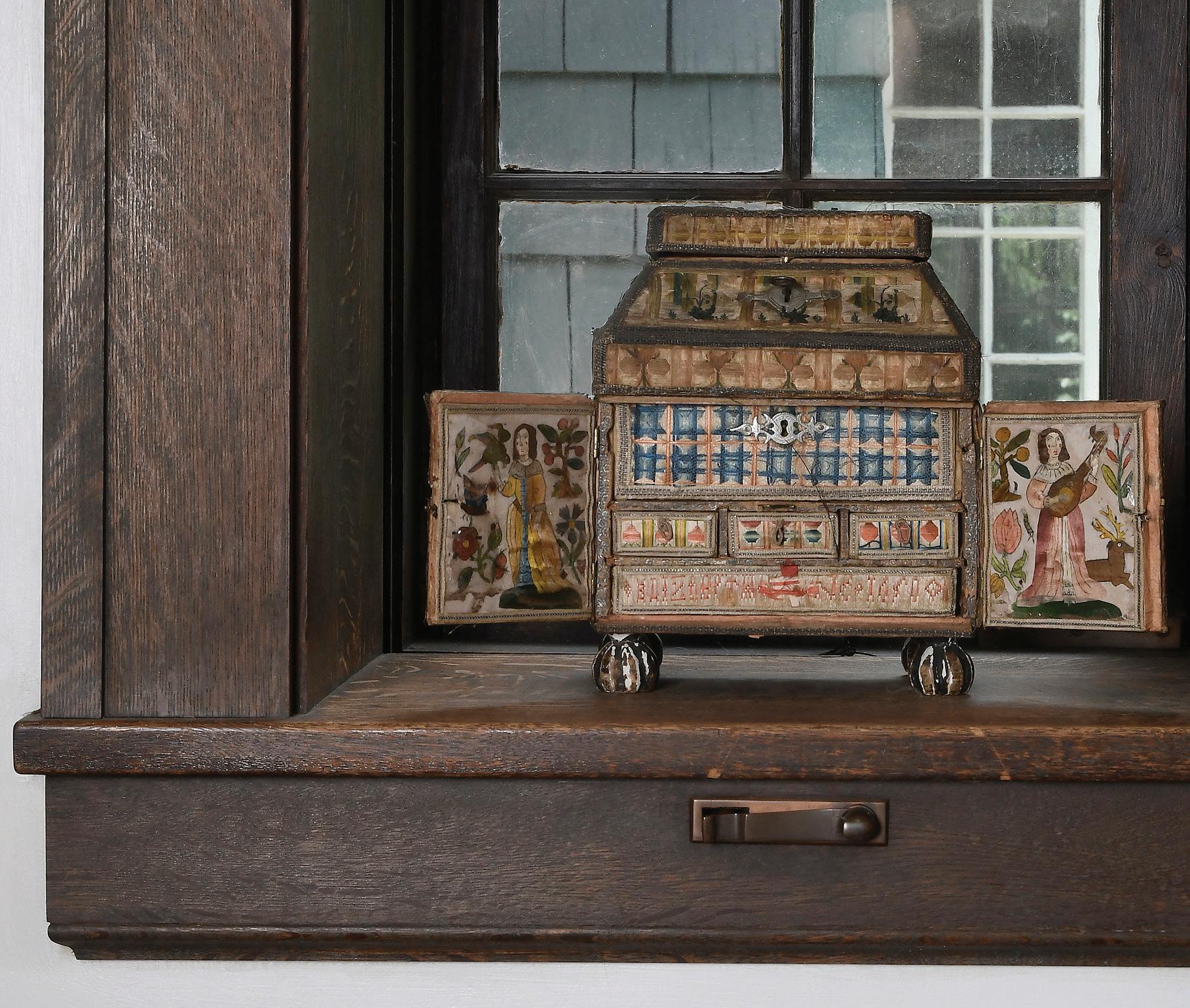 For a collection as singular as that of John and Marie-Teresa Vander Sande, a single auction would not suffice. Now we find ourselves at the second, one every bit as grand and rich in beautiful examples of 17th and 18th century furniture, ceramics, glass, and more as the one previous. The love the Vander Sandes had, and still have, for this era of history is readily evident from looking at this collection. The human element, that factor most important to them in any given piece, is well-represented in each object in the sale. That being said, everything previously mentioned about the Vander Sande’s collection still rings true here and now, and as such the reader will not be belabored with repetition. Instead, the focus will be on the new, and there is a considerable amount of it worthy of mention. The highlights of this sale include a Boston Cromwellian high back chair of extreme rarity, a rare Massachusetts carved joined chest, three Benjamin Blythe-attributed portraits, four carved Nottingham double-walled mugs, and a Charles II needlework writing box. But these are only a few of the many wonderful works to be included in this auction. We invite you to peruse the full sale at your leisure, and join us in another journey down the High Road.