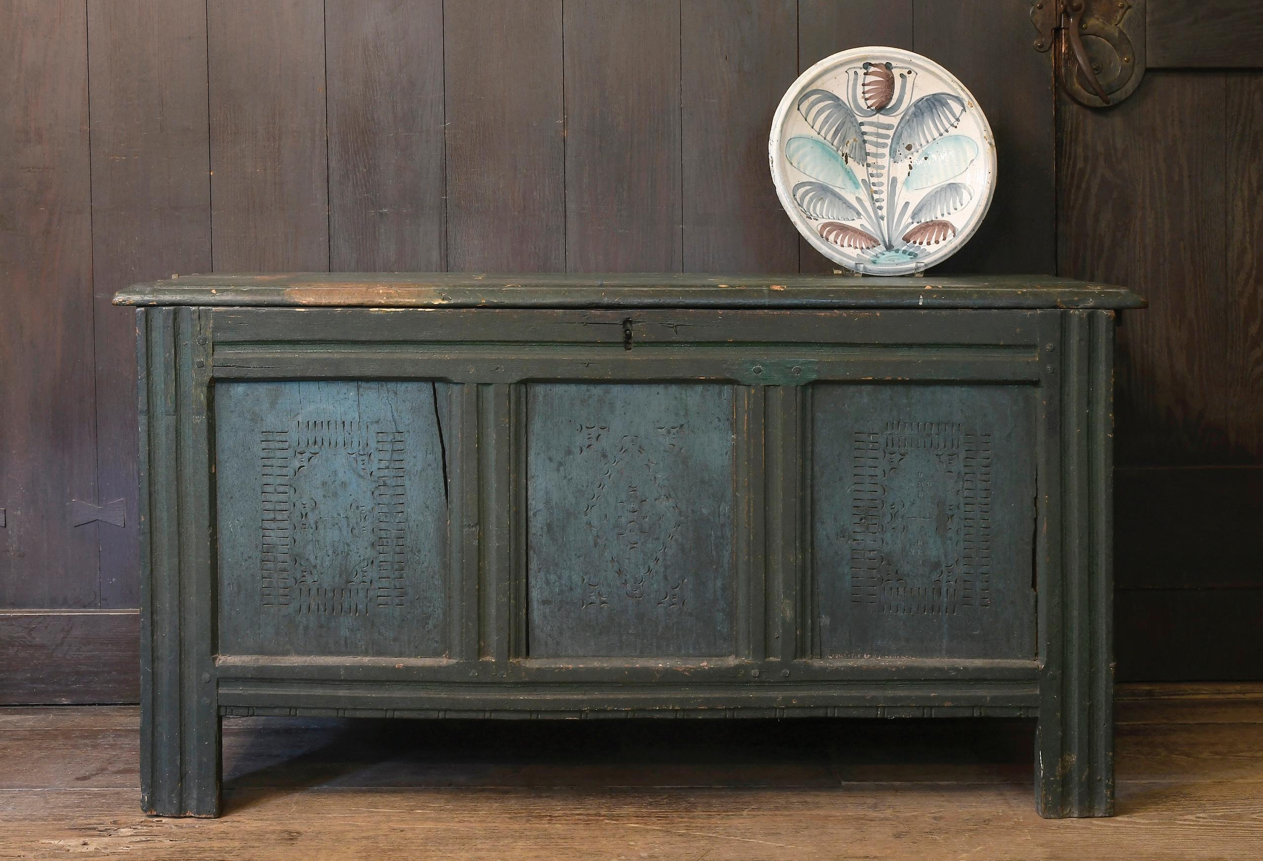 Rare Massachusetts Pilgrim Century Chip Carved and Green Painted Chest, probably Marshfield, circa 1690
