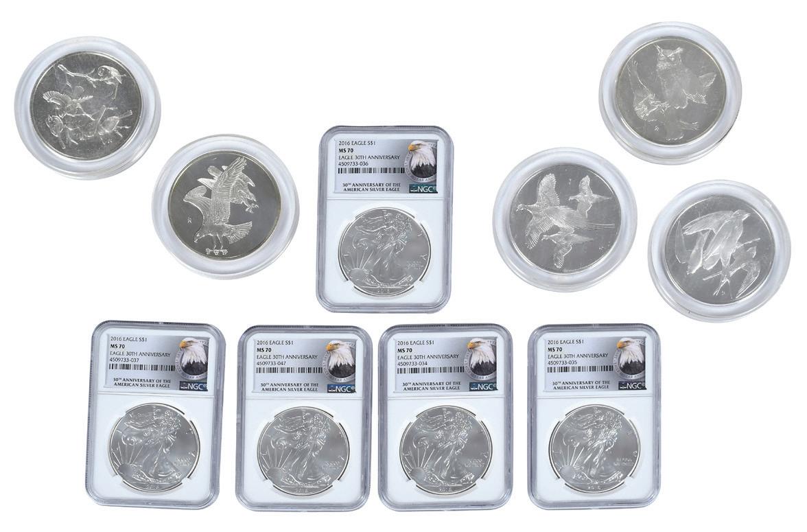 Five American Silver Eagles and Five Sterling “Roberts Birds” Rounds five 2016 American Silver Eagles; five Gilroy Roberts bird themed round medallions by Franklin Mint: Swallows, Chickadees, Ringnecked Pheasants, Great Horned Owls, and Ospreys (each 1,000 grains of sterling silver), Silver Eagles graded MS70; sterling medallions with visible handling marks