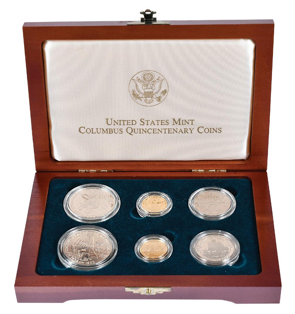 1992 Columbus Quincentenary 6-Coin Set, UNC and Proof set contains 0.483 oz. T. of gold and 1.546 oz. T. of silver, coins as issued; light wear to wooden box