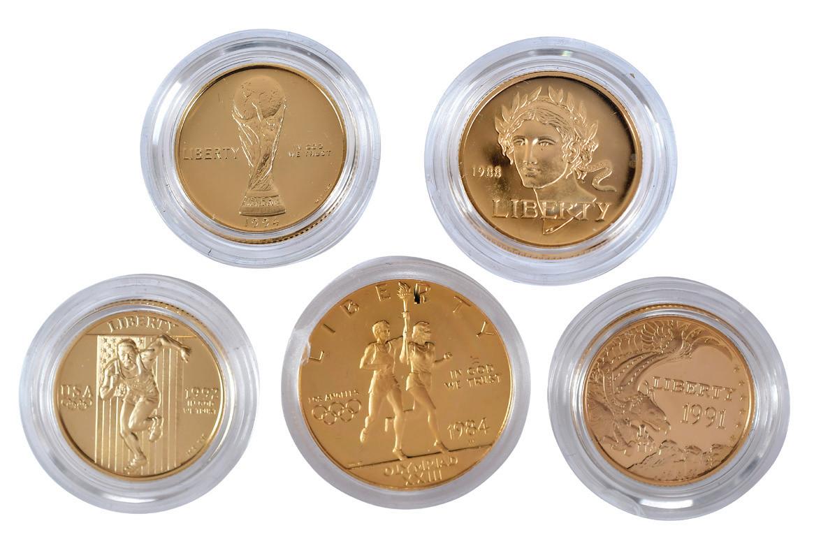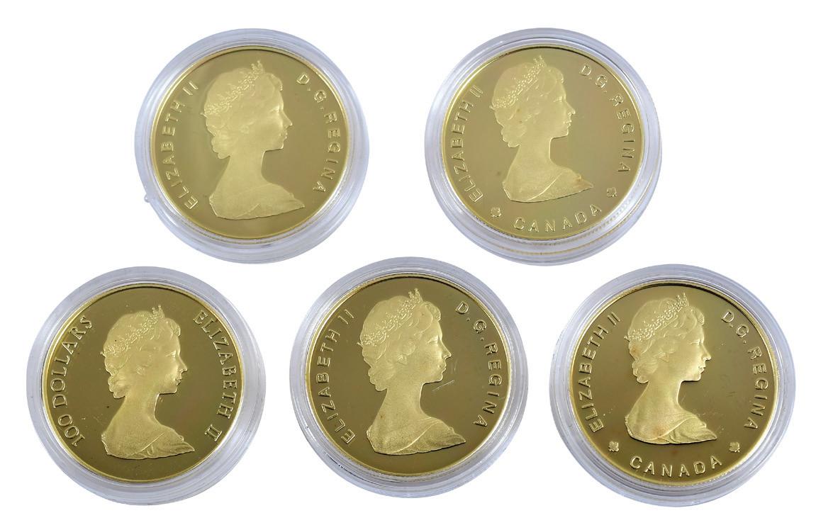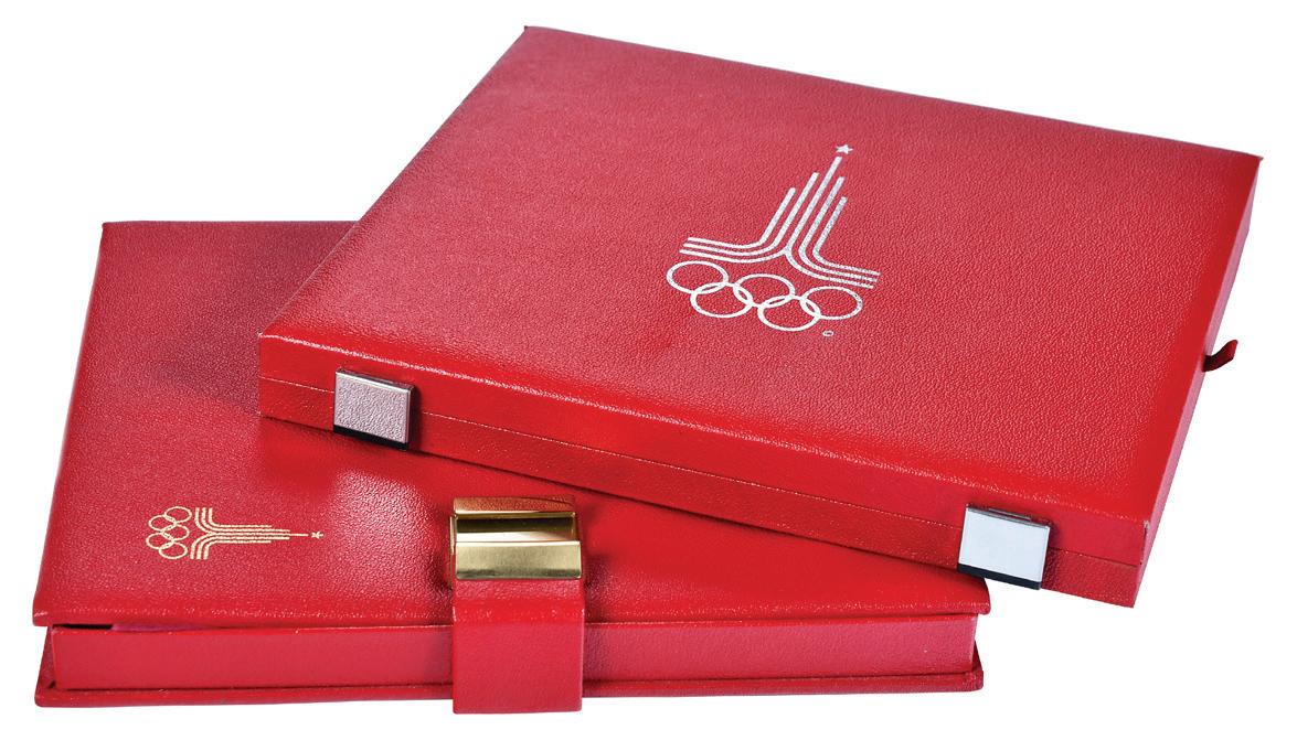 Russian Olympic Gold Set, Six 100 Rouble Coins 1980 Moscow Olympics; 100 Roubles face value; each coin one-half ounce of gold, new, in original packaging