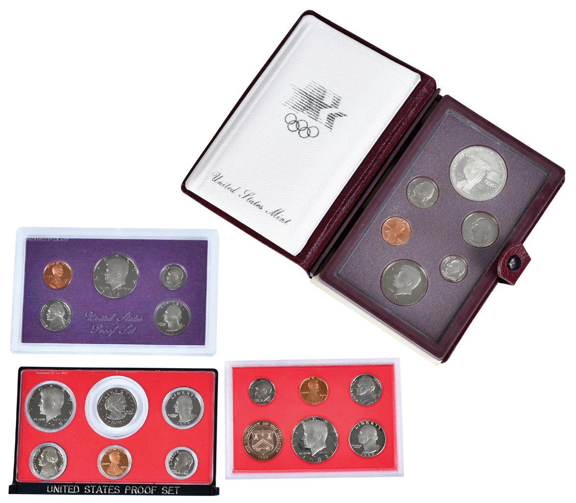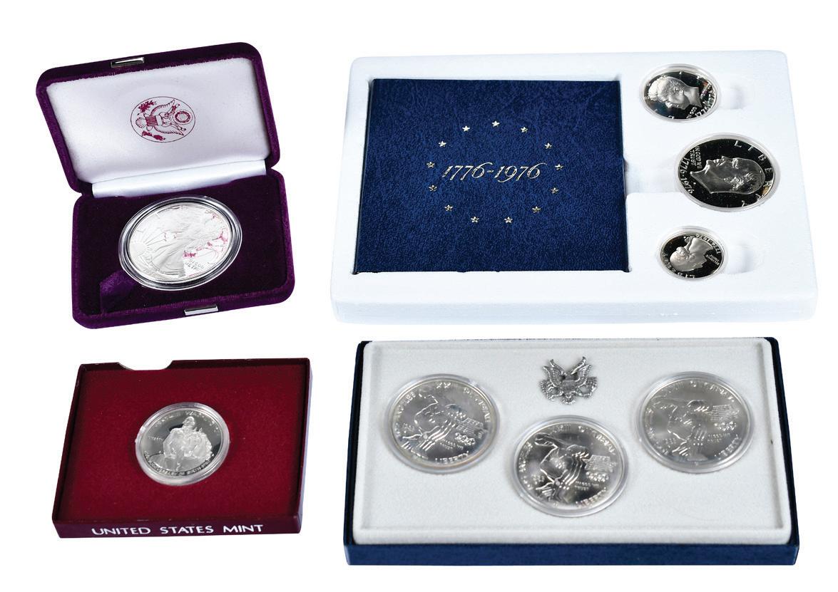 (5) Bicentennial three coin 40% silver sets; 1999 proof Susan B. Anthony dollar; 1999 proof American Silver Eagle; 1986 proof American Silver Eagle; (3) 1982 George Washington UNC half dollars; 1983 P-D-S Olympic silver dollar set; 1984 proof Olympic silver dollar; 1996 Dolley Madison proof silver dollar; 1999 Yellowstone proof silver dollar, new, in original packaging