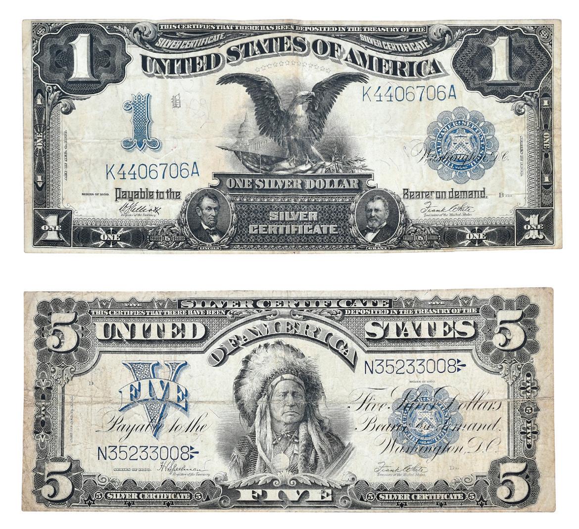 series of 1899 Black Eagle $1; series of 1899 Chief Onc Papa $5, each well worn, creasing, some losses or small tears