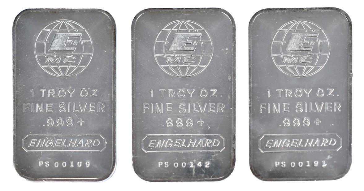Seven Vintage Engelhard 10-Ounce “Loaf-Style” Silver Bars consecutive “P” serial numbers, 70 oz. T. total, like new with attractive toning